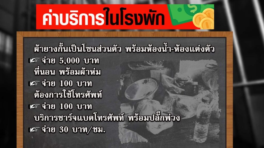 ผู้ต้องหาบางคนติดอยู่ในห้องขังเป็นเดือน จ่ายเงินให้สิบเวร 5,000 บาท แลกกับความสะดวกสบายภายในห้องขัง ให้พูดคุยผ่านตัวกลาง คือ ชาวเมียนมาซึ่งก็เป็นผู้ต้องหาเช่นเดียวกันจะคอยเดินเซอร์วิสตามห้องขังว่าผู้ต้องหาแต่ละคนต้องการอะไรบ้าง โดยที่คนกลางจะเป็นคนเรียกสิบเวรมาเปิดประตูให้ จากนั้น คนกลางจะค่อยเดินส่งของให้ตามห้องขัง เช่น หากต้องการที่นอนต้องจ่าย 100 บาท จะมีคนปูที่นอนพร้อมผ้าห่มให้พร้อม รวมถึงมีบริการอย่างอื่น เช่น หากต้องการใช้โทรศัพท์ก็จ่ายเงิน 100 บาท และถ้าแบตโทรศัพท์หมดก็มีบริการชาร์จชั่วโมงละ 30 บาท พร้อมปลั๊กพ่วง เพราะมีบริการ Wi-Fi 50-100 บาท ถ้าหิวและต้องการกินอะไรก็จ่าย 100 บาท มีมาม่าให้ 2 ห่อ พร้อมกระติกและถ้วยชามน้ำร้อนมีรูมเซอร์วิสส่งตรงถึงห้องขัง กาแฟ 50 บาท 2 ซอง