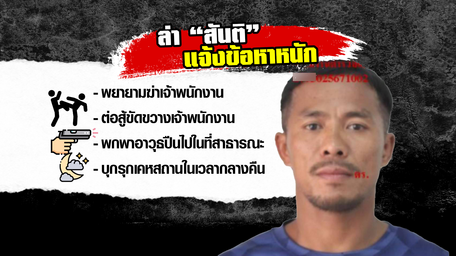 กทม. 6 ต.ค.-ตำรวจเร่งล่า “สันติ” อดีตนักมวย หลังศาลออกหมายจับ 4 ข้อหาหนัก ในคดีใช้ปืนยิงเปิดทาง เข้าไปจับแพทย์ เป็นตัวประกันในบ้านย่านอินทามระ ก่อนหลบหนีไปได้ ขณะที่ภรรยานายสันติ ห่วงความปลอดภัยสามี วอนขอให้เข้ามอบตัว