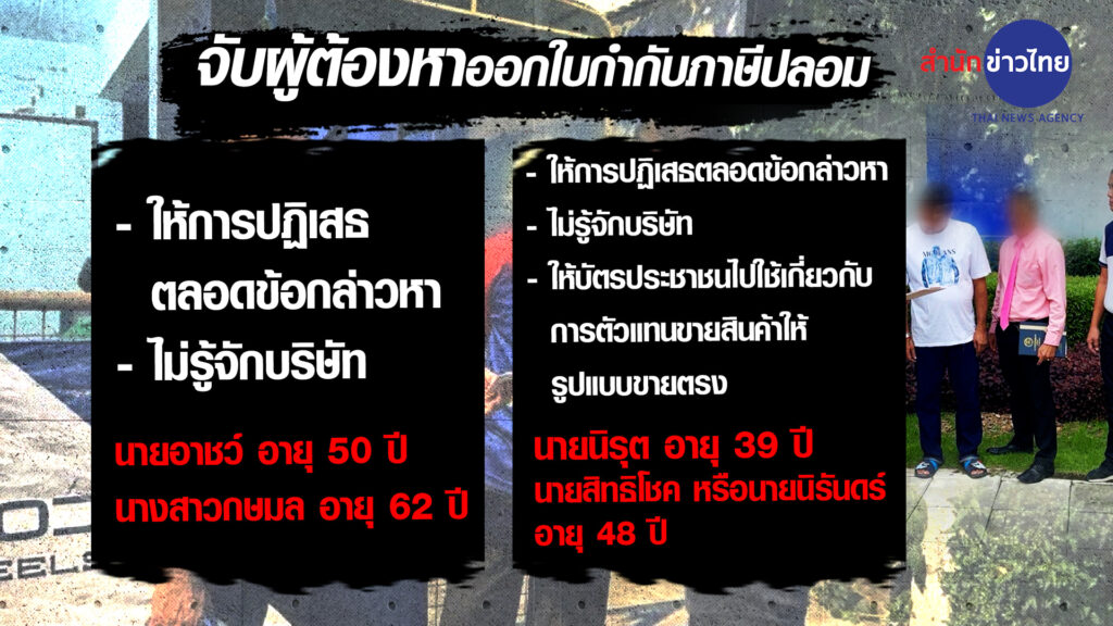 ผู้ต้องหามีทั้งหมด 4 คน นายอาชว์ อายุ 50 ปี นางสาวกษมล อายุ 62 ปี นายนิรุต อายุ 39 ปี นายสิทธิโชค หรือนายนิรันดร์ อายุ 48 ปี พฤติการณ์ เนื่องด้วยกรมสรรพากรได้มาร้องทุกข์ กับตำรวจ ให้พิจารณาดำเนินคดีอาญาความผิดกับ บริษัทแห่งหนึ่ง และอดีตกรรมการบริษัททั้งสิ้น 4 ราย ในข้อหา “ร่วมกันออกใบกำกับภาษีโดยไม่มีสิทธิที่จะออกตามกฎหมาย เหตุเกิดช่วงเดือนมีนาคม 2557 บริษัทเกี่ยวข้องกับประกอบธุรกิจการขายวัสดุก่อสร้าง แต่กรมสรรพากร ตรวจสอบพบว่าบริษัทเป็นอาคารพาณิชย์ สามชั้นครึ่ง สภาพเก่า ไม่พบการประกอบกิจการ สอบถามผู้อาศัยข้างเคียงให้การว่า บริษัท ได้ยกเลิกการเช่าอาคารดังกล่าว เมื่อปลายเดือนกันยายน 2559 และไม่ทราบว่าย้ายไปที่ใด ไม่สามารถติดต่อได้