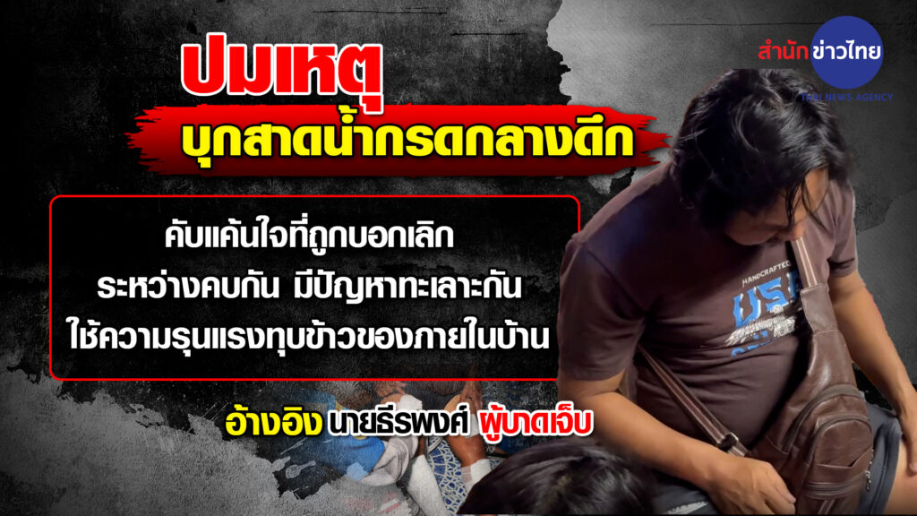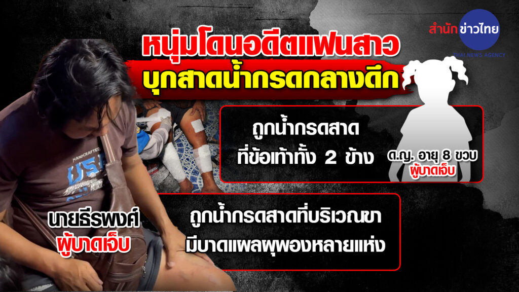 เมื่อสอบถาม นายธีรพงศ์ (ผู้บาดเจ็บ) เล่าว่า ผู้ก่อเหตุคืออดีตแฟนที่คบกันมาประมาณ 1 ปี และเพิ่งเลิกลากันได้ไม่นาน ช่วงเกิดเหตุตนกำลังอาบน้ำอยู่ภายในบ้าน เมื่ออาบเสร็จเปิดประตูห้องน้ำก็พบอดีตแฟนสาวยืนอยู่หน้าประตู จากนั้นอดีตแฟนสาวเมื่อเห็นตนก็สาดใส่ทันที แล้วก็เดินออกไปไม่ได้พูดอะไร เมื่อวานก่อนเกิดเหตุอดีตแฟนก็เอาน้ำเปล่ามาสาดใส่หลานตน ส่วนสาเหตุคาดว่าน่าจะเป็นเรื่องคับแค้นใจที่ตนได้บอกเลิกราฝ่ายหญิงไปได้สักพักแล้ว เพราะระหว่างคบกันมักมีปัญหาทะเลาะกันใช้ความรุนแรงทุบข้าวของภายในบ้าน หลังก่อเหตุก็หลบหนีเข้าไปอยู่ในบ้านที่เช่าไว้หลังติดกัน