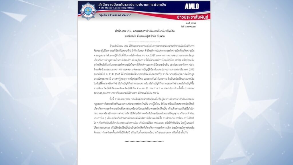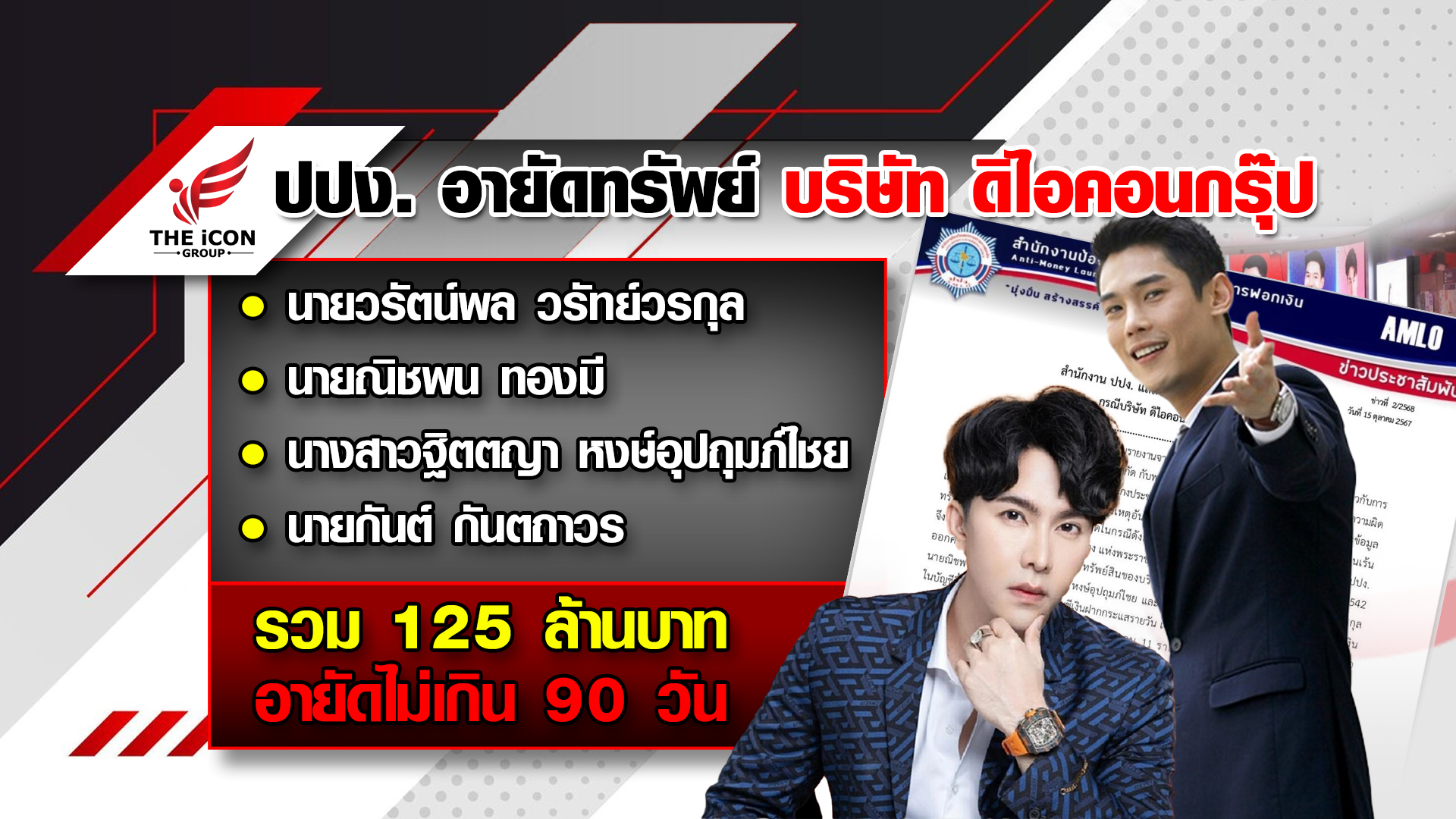 ด้วยสำนักงาน ปปง. ได้รับรายงานจากกองบังคับการปราบปรามการกระทำความผิดเกี่ยวกับการคุ้มครองผู้บริโภค รายบริษัท ดิไอคอนกรุ๊ป จำกัด กับพวก ซึ่งมีพฤติการณ์แห่งการกระทำความผิดเกี่ยวกับความผิดตามกฎหมายว่าด้วยการกู้ยืมเงินที่เป็นการฉ้อโกงประชาชน พ.ศ. 2527 และจากการตรวจสอบรายงานและข้อมูลเกี่ยวกับการทำธุรกรรมในกรณีดังกล่าว มีเหตุอันควรเชื่อได้ว่าอาจมีการโอน ยักย้าย ปกปิด หรือซ่อนเร้นทรัพย์สินที่เกี่ยวกับการกระทำความผิดในกรณีดังกล่าวและกรณีมีความจำเป็นเร่งด่วน เลขาธิการ ปปง. จึงอาศัยอำนาจตามมาตรา 48 วรรคสอง แห่งพระราชบัญญัติป้องกันและปราบปรามการฟอกเงิน พ.ศ. 2542 ออกคำสั่งที่ ย. 214/ 2567 ให้อายัดทรัพย์สินของบริษัท ดิไอคอนกรุ๊ป จำกัด นายวรัตน์พล วรัทย์วรกุล นายณิชพน ทองมี นางสาวฐิตตญา หงษ์อุปถุมภ์ไชย และนายกันต์ กันตถาวร ซึ่งเป็นทรัพย์สินประเภทเงินในบัญชีซื้อขายหลักทรัพย์ เงินในบัญชีเงินฝากกระแสรายวัน เงินในบัญชีเงินฝากออมทรัพย์ และเงินในบัญชีซื้อขายสินทรัพย์ดิจิทัลและสินทรัพย์ดิจิทัล จำนวน 11 รายการ รวมราคาประเมินทั้งสิ้นประมาณ 125,548,076.99 บาท พร้อมดอกผลไว้ชั่วคราว มีกำหนดไม่เกิน 90 วัน