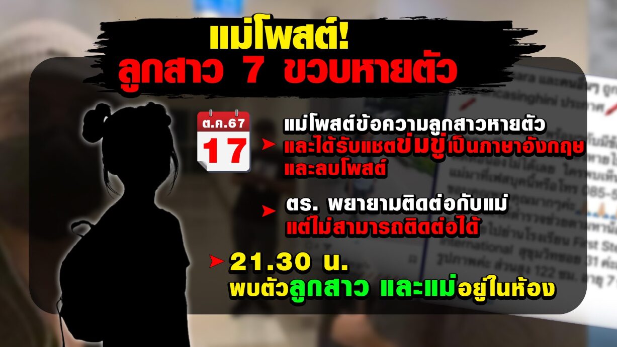 กทม. 18 ต.ค. – แม่โพสต์ลูกสาว 7 ขวบ หายจากโรงเรียนย่านสุขุมวิท สุดท้ายคดีพลิก! ตำรวจไปหาที่คอนโด พบเด็กพูดคุยยิ้มแย้มแจ่มใส ไม่ได้หายไปไหน แต่อยู่กับแม่ในห้อง