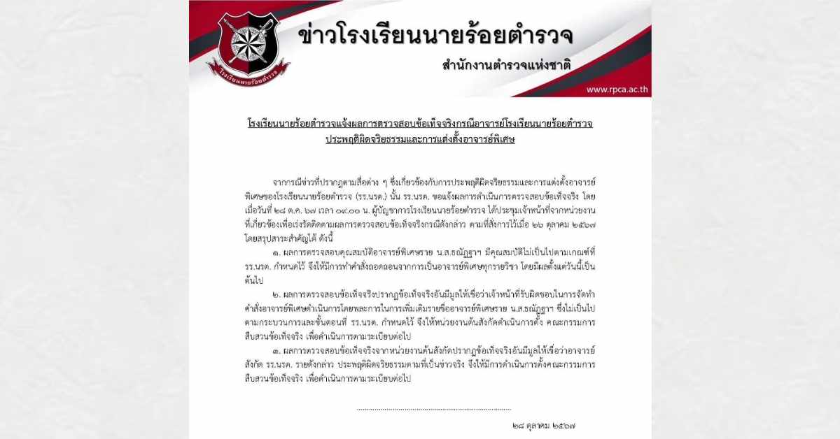 โรงเรียนนายร้อยตำรวจ เผยแพร่เอกสารแจ้งผลการตรวจสอบข้อเท็จจริงกรณีอาจารย์โรงเรียนนายร้อยตำรวจ ประพฤติผิดจริยธรรมและการแต่งตั้งอาจารย์พิเศษจากกรณีข่าวที่ปรากฏตามสื่อต่างๆ ซึ่งเกี่ยวข้องกับการประพฤติผิดจริยธรรมและการแต่งตั้งอาจารย์พิเศษของโรงเรียนนายร้อยตำรวจ (รร.นรต.) นั้น โดย รร.นรต. ขอแจ้งผลการดำเนินการตรวจสอบข้อเท็จจริง โดยเมื่อวันที่ 28 ต.ค.67 เวลา 09.00 น. ผู้บัญชาการโรงเรียนนายร้อยตำรวจ ได้ประชุมเจ้าหน้าที่จากหน่วยงานที่เกี่ยวข้องเพื่อเร่งรัดติดตามผลการตรวจสอบข้อเท็จจริงกรณีดังกล่าว ตามที่สั่งการไว้เมื่อ 26 ต.ค.67