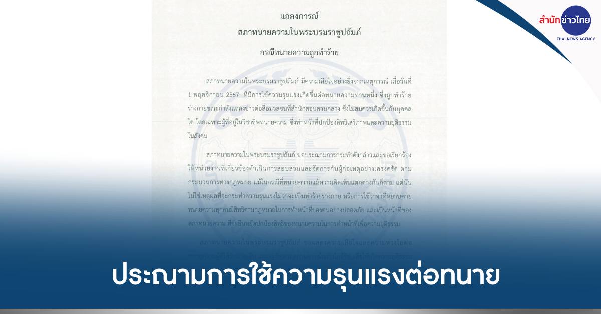 สภาทนายความในพระบรมราชูปถัมภ์ มีความเสียใจอย่างยิ่งจากเหตุการณ์ เมื่อวันที่ 1 พฤศจิกายน 2567 ที่มีการใช้ความรุนแรงเกิดขึ้นต่อทนายความท่านหนึ่ง ซึ่งถูกทำร้ายร่างกายขณะกำลังแถลงข่าวต่อสื่อมวลชนที่สำนักสอบสวนกลาง ซึ่งไม่สมควรเกิดขึ้นกับบุคคลใด โดยเฉพาะผู้ที่อยู่ในวิชาชีพทนายความ ซึ่งทำหน้าที่ปกป้องสิทธิเสรีภาพและความยุติธรรม ในสังคม
