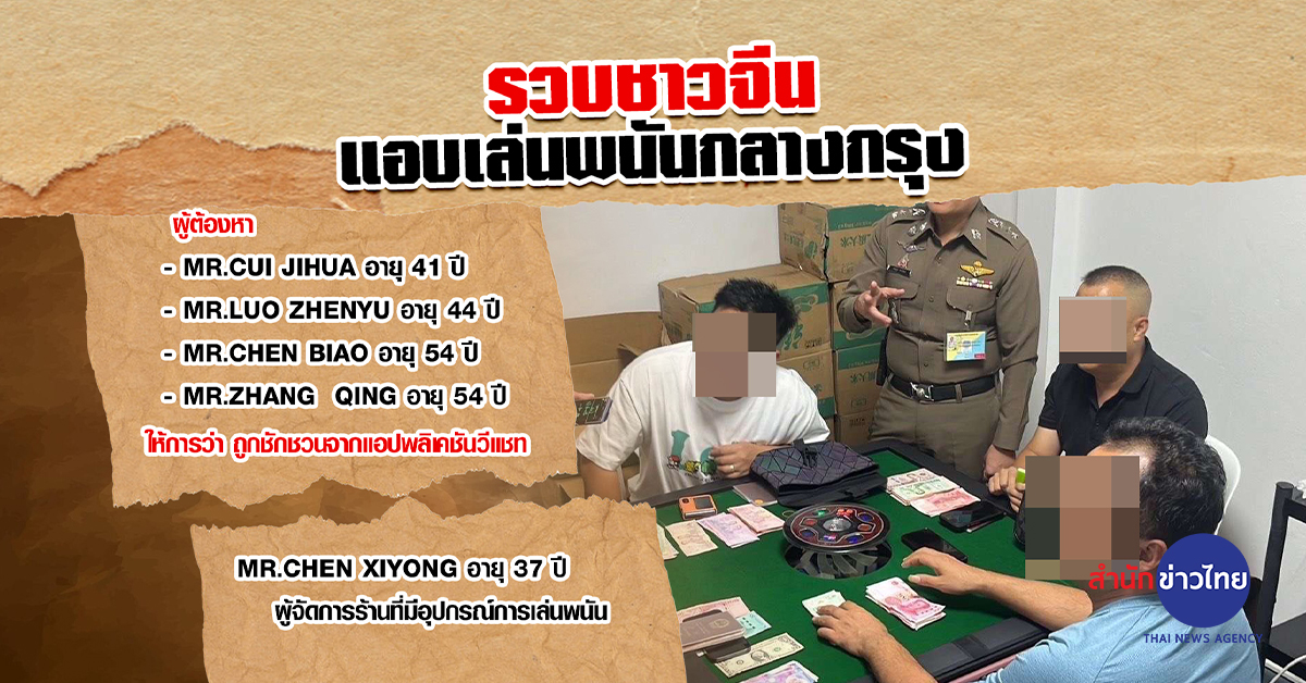 ตำรวจเปิดปฏิบัติการจับกุมเมื่อคืนที่ผ่านมา (9 พ.ย.) ที่ร้านอาหารจีนแห่งหนึ่งในซอยลาดพร้าว 80 แยก 22 แขวงวังทองหลาง กรุงเทพฯ หลังตำรวจชุดจับกุม สน.วังทองหลาง รับข้อมูลมาจากสายลับว่าร้านดังกล่าวลักลอบเปิดให้เล่นการพนัน จากการตรวจค้นพบในร้านมีห้องวีไอพี และมีชายชาวจีน 4 คน กำลังเล่นไพ่นกกระจอกอยู่ที่โต๊ะเล่นอัตโนมัติ ทราบชื่อคือ 1.MR.CUI JIHUA อายุ 41 ปี 2.MR.LUO ZHENYU อายุ 44 ปี 3.MR.CHEN BIAO อายุ 54 ปี 4.MR.ZHANG QING อายุ 54 ปี ทั้งหมดให้การว่าถูกชักชวนจากแอปพลิเคชันวีแชท