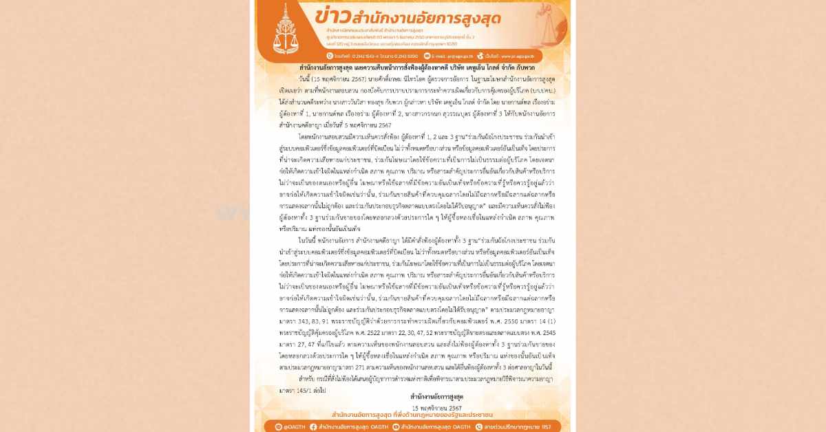 15 พ.ย. – อัยการสั่งฟ้อง “แม่ตั๊ก-ป๋าเบียร์” ร่วมกันฉ้อโกงประชาชน นำเข้าข้อมูลเท็จสู่ระบบคอมพิวเตอร์ ร่วมกันโฆษณาไม่เป็นธรรม ร่วมกันขายสินค้าควบคุมไม่มีฉลาก ร่วมกันประกอบธุรกิจตลาดแบบตรงโดยไม่ได้รับอนุญาต และไม่สั่งฟ้องร่วมกันขายของหลอกลวง