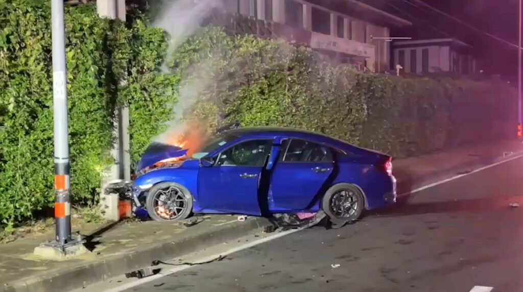 ที่เกิดเหตุไฟกำลังโหมไหม้รถยนต์ฮอนด้า ซีวิค สีน้ำเงิน ที่อยู่ในสภาพพุ่งเสยเสาไฟริมทาง ใช้เวลาประมาณ 20 นาที เจ้าหน้าที่สามารถควบคุมเพลิงไว้ได้ แต่รถยนต์ถูกไฟไหม้เสียหายทั้งคัน