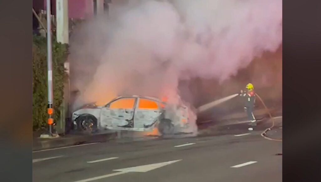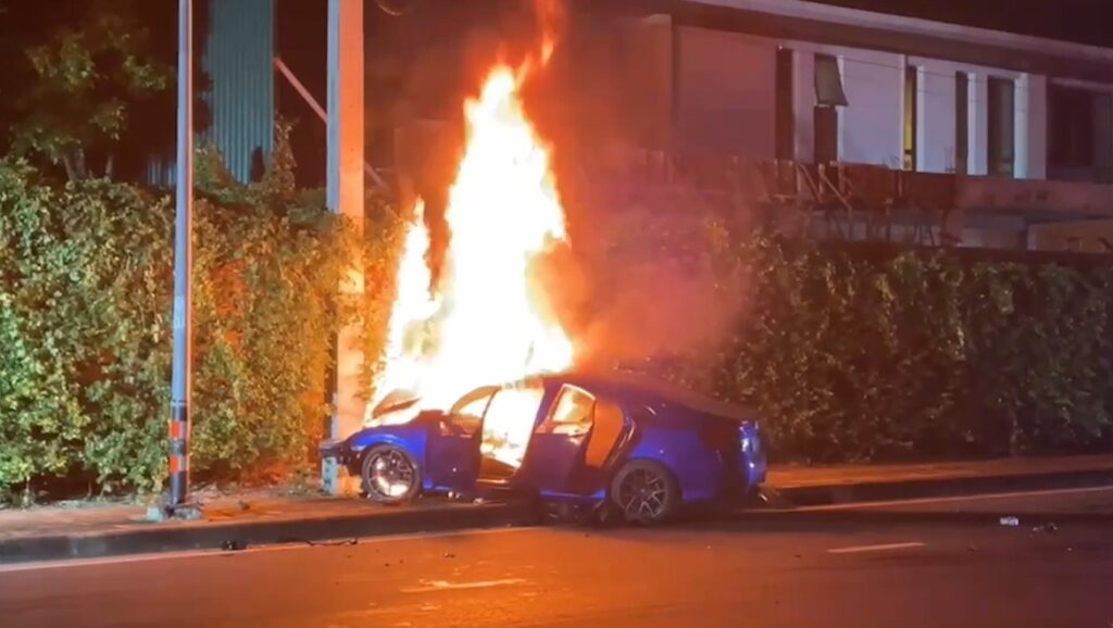 ผู้แจ้งเหตุให้การกับตำรวจว่า เห็นรถยนต์คันดังกล่าวขับมาด้วยความเร็ว ก่อนพุ่งเหินข้ามเกาะกลางถนนไปเสียหลักชนเสาไฟฟ้า จากนั้นไม่นานมีเปลวเพลิงพุ่งออกมาจากใต้ห้องเครื่องยนต์ ขณะเกิดเหตุมีพลเมืองดีเข้าช่วยเหลือคนขับผู้ชายและหญิงสาวที่นั่งมาด้วยออกจากรถได้ทันก่อนเกิดไฟไหม้รุนแรง