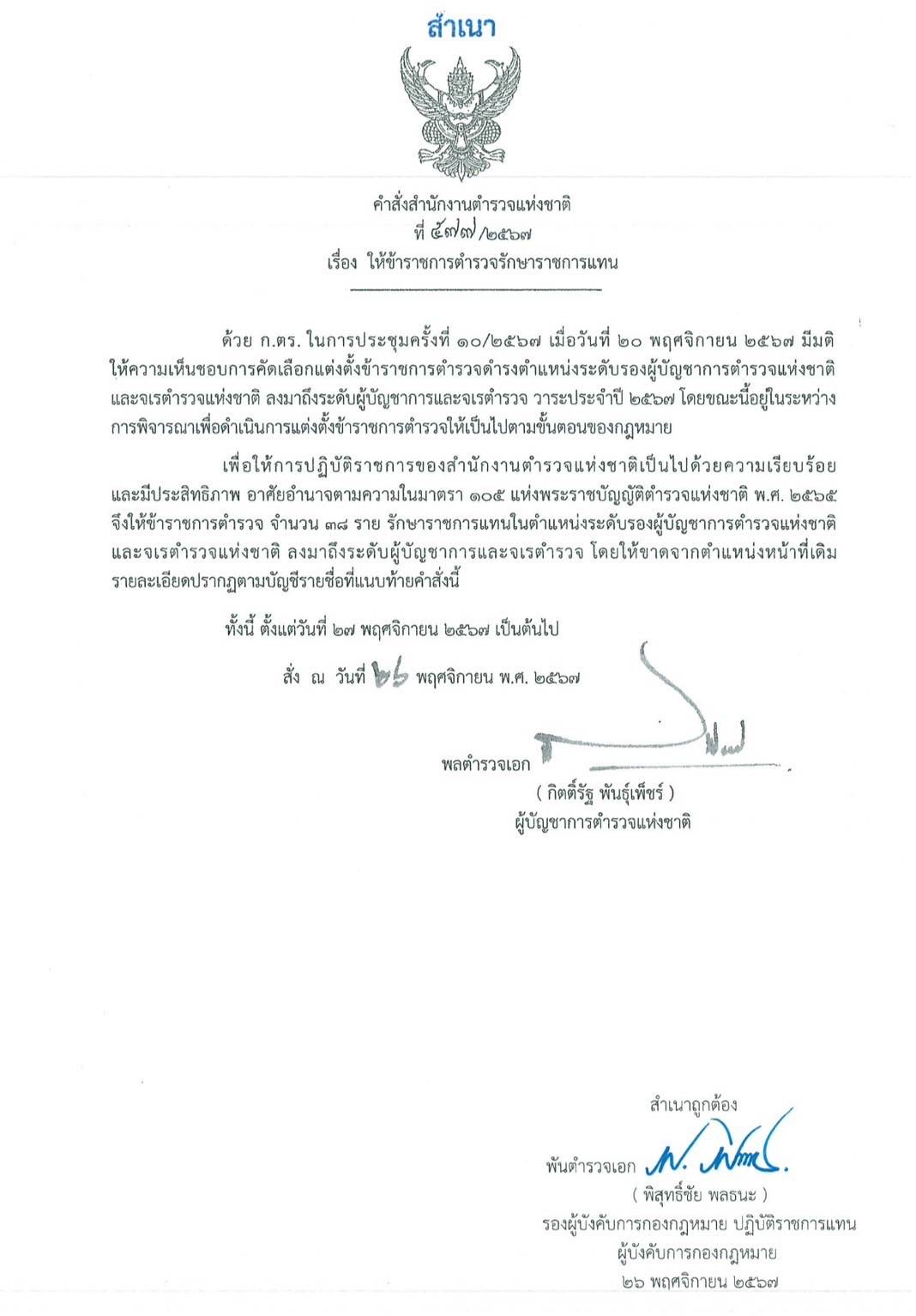 เมื่อเวลา 20.00 น. วันที่ 26 พ.ย.67 พล.ต.อ.กิตติ์รัฐ พันธุ์เพ็ชร์ ผู้บัญชาการตำรวจแห่งชาติ ลงนามคำสั่งสำนักงานตำรวจแห่งชาติ ที่ 577/2567 เรื่อง ให้ข้าราชการตำรวจรักษาราชการแทน
