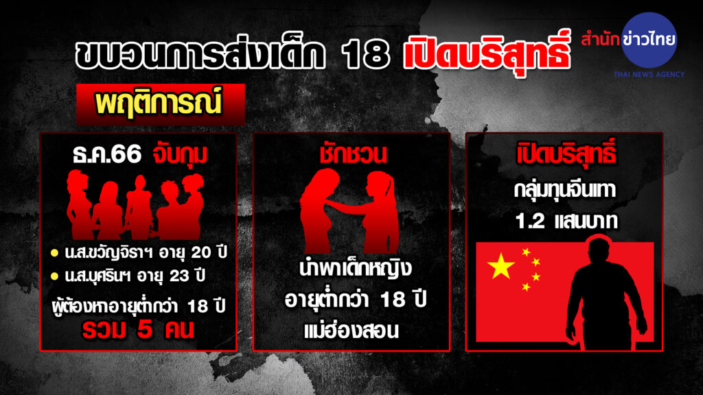 ตำรวจขยายผลหลังเดือนธันวาคมปี 2566 ตำรวจ ปคม. ได้จับกุมผู้ต้องหาที่อายุต่ำกว่า 18 ปี รวม 5 ราย ร่วมกันชักชวนและนำพาเด็กหญิงอายุต่ำกว่า 18 ปี จากจังหวัดแม่ฮ่องสอน ไปขายบริการทางเพศให้กับผู้ซื้อบริการซึ่งเป็นนายทุนกลุ่มจีนเทา ต่อมาจากการสืบสวนขยายผลของ ทราบว่า 2 สาวที่จับกุมครั้งนี้ ร่วมอยู่ในเครือข่ายด้วย ชักชวนหญิงสาวผู้เสียหาย ซึ่งในขณะเกิดเหตุอายุต่ำกว่า 18 ปี และไม่เคยผ่านการมีเพศสัมพันธ์ ไปขายบริการ โดยผู้เสียหายคนดังกล่าวจะได้รับค่าตอบแทน เป็นเงิน 120,000 บาท ซึ่งกลุ่มผู้ต้องหาได้หักค่านายหน้าไว้ ตำรวจจึงได้รวบรวมพยานหลักฐานและขอศาลออกหมายจับ