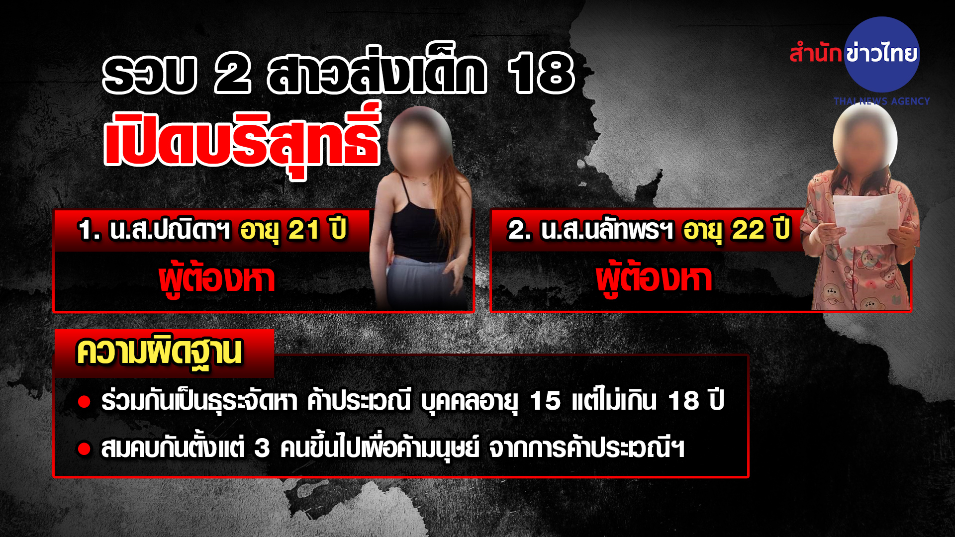 พล.ต.ท.จิรภพ ภูริเดช ผู้บัญชาการสอบสวนกลาง สั่งการให้กองบังคับการปราบปรามการค้ามนุษย์ นำเจ้าหน้าที่ร่วมกันจับกุมผู้ต้องหา 2 รายถึงห้องพัก ได้แก่ 1.น.ส.ปณิดา อายุ 21 ปี ผู้ต้องหาตามหมายจับศาลอาญา บริเวณคอนโดมิเนียมในพื้นที่ถนนพระราม 9 แขวงห้วยขวาง เขตห้วยขวาง กรุงเทพมหานคร และอีกราย น.ส.นลัทพร อายุ 22 จับกุมได้บริเวณหน้าร้านนวดแห่งหนึ่งในพื้นที่ หมู่ 5 ต.ท่าระหัด อ.เมืองสุพรรณบุรี จ.สุพรรณบุรี ข้อหา “ร่วมกันเป็นธุระจัดหา ซื้อ ขาย จำหน่าย พามาจากหรือส่งไปยังที่ใด หน่วงเหนี่ยวกักขัง จัดให้อยู่อาศัยหรือรับไว้ซึ่งเด็ก โดยมีความมุ่งหมายเพื่อเป็นการแสวงหาประโยชน์โดยมิชอบจากการค้า กระทำผิดฐานค้ามนุษย์ เป็นการกระทำแก่บุคคลอายุเกินสิบห้าปี แต่ไม่เกินสิบแปดปี, สมคบโดยการตกลงกันตั้งแต่สามคนขึ้นไปเพื่อกระทำความผิดฐานค้ามนุษย์โดยแสวงหาประโยชน์จากการค้าประเวณีฯ”