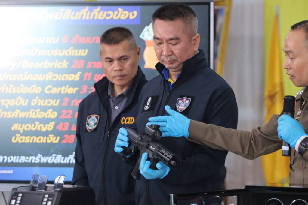 พร้อมตรวจยึดของกลางและทรัพย์สินที่เกี่ยวข้อง เป็นรถยนต์และจักรยานยนต์จำนวน 7 คัน มูลค่ารวมกว่า 63 ล้านบาท และสามารถยึดนาฬิกาหรูจำนวน 8 เรือน มูลค่ารวมประมาณ 47.5 ล้านบาท ตรวจยึดเงินสด 6 ล้านบาท กำไลข้อมือ กระเป๋าแบรนด์เนม โมเดลอาร์ททอย แบร์บริค 28 รายการ อุปกรณ์คอมพิวเตอร์ 11 ชุด อาวุธปืน 2 กระบอก โทรศัพท์มือถือ 22 เครื่อง สมุดบัญชี 43 เล่ม และบัตรกดเงิน 28 ใบ รวมมูลค่าทรัพย์สินกว่า 110 ล้านบาท