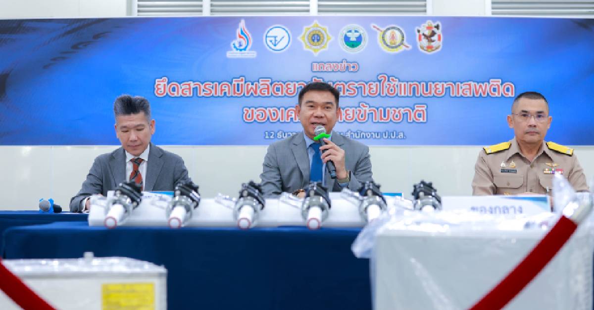 ป.ป.ส. 12 ธ.ค. – พล.ต.ท.ภาณุรัตน์ หลักบุญ เลขาธิการ ป.ป.ส. พร้อมด้วย นายปฤณ เมฆานันท์ ผู้อำนวยการสำนักปราบปรามยาเสพติด และพลเรือตรี หัตถกรนันท์ ศิรธนพรพัชร์ รองหัวหน้าฝ่ายข่าว ศูนย์อำนวยการป้องกัน และปราบปรามยาเสพติดกองทัพเรือ (ศอ.ปส.ทร.) แถลงข่าวการตรวจยึดสารเคมีที่ใช้ในกระบวนการผลิตสารเอโทมีเดท (Etomidate) จำนวน 7 รายการ สารเคมีจำนวน 11 ถัง น้ำหนัก 2,200 ลิตร และสารเคมีจำนวน 10 ถุง น้ำหนัก 250 กิโลกรัม พร้อมอุปกรณ์ที่ใช้ในกระบวนการผลิตสารเคมีหลายรายการ เช่น เครื่องทำความเย็น เครื่องทำความร้อน หลอดแก้วและอุปกรณ์ที่ใช้ในห้องปฏิบัติการ ฯลฯ เหตุเกิดที่ โกดังเก็บสารเคมี แขวงแสมดำ เขตบางขุนเทียน กทม.