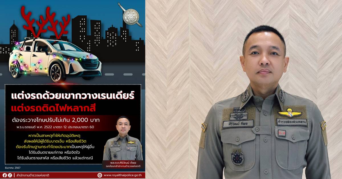 ตร. 16 ธ.ค. – ตร.เตือนแต่งรถด้วย “เขากวางเรนเดียร์” และ “ไฟหลากสี” เข้าข่ายผิดกฎหมาย โทษปรับไม่เกิน 2,000 บาท