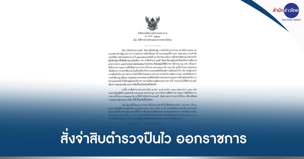ทั้งนี้ ตั้งแต่บัดนี้เป็นต้นไป อนึ่ง ผู้ถูกสั่งให้ออกจากราชการไว้ก่อนตามคำสั่งนี้ มีสิทธิอุทธรณ์ต่อ ก.พ.ค.ตร. ได้ตามพระราชบัญญัติตำรวจแห่งชาติ พ.ศ.2565 มาตรา 141 ภายใน 30 วันนับแต่วันรับทราบคำสั่ง และประสงค์โต้แย้งคำสั่งหรือคำวินิจฉัยอุทธรณ์นี้ให้ทำห้ทำฟ้องเป็นหนังสือยื่นต่อศาลปกครองหรือส่งทางไปรษณีย์ลงทะเบียนไปยังศาลปกครองภายใน 90 วัน นับแต่วันที่ได้รับแจ้งหรือรับทราบคำวินิจฉัยอุทธรณ์ หรือภายใน 90 วันนับแต่วันพ้นกำหนด 90 วัน นับแต่วันที่ผู้ฟ้องคดีได้มีหนังสือร้องขอทราบผลการวินิจฉัยอุทธรณ์ สั่ง ณ วันที่ 16 ธันวาคม พ.ศ.2567.-419.-สำนักข่าวไทย