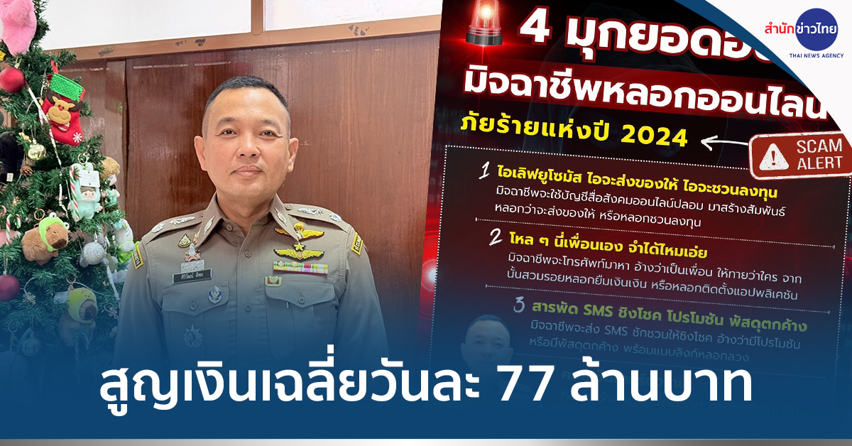 กรุงเทพฯ 22 ธ.ค.- ตร.ตีแผ่ 4 มุกยอดฮิต มิจฉาชีพออนไลน์ ภัยร้ายแห่งปี 2024 พบมีผู้เสียหายถูกหลอกออนไลน์ สูญเงินเฉลี่ยวันละ 77 ล้านบาท