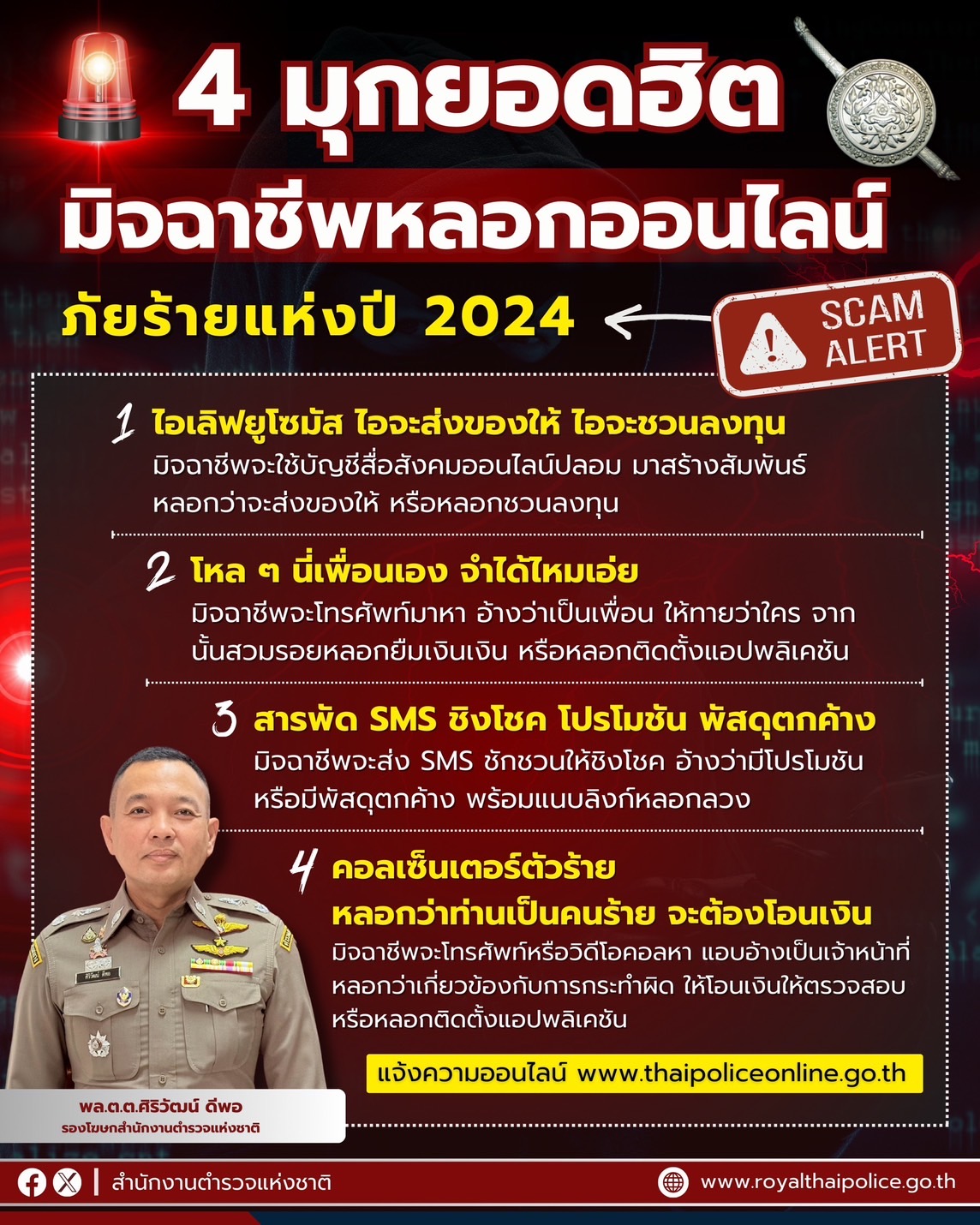 สำนักงานตำรวจแห่งชาติ จึงขอตีแผ่ 4 มุกยอดฮิต มิจฉาชีพออนไลน์ ภัยร้ายแห่งปี 2024 เพื่อให้ประชาชนรู้เท่าทันกลลวงของมิจฉาชีพ ดังนี้