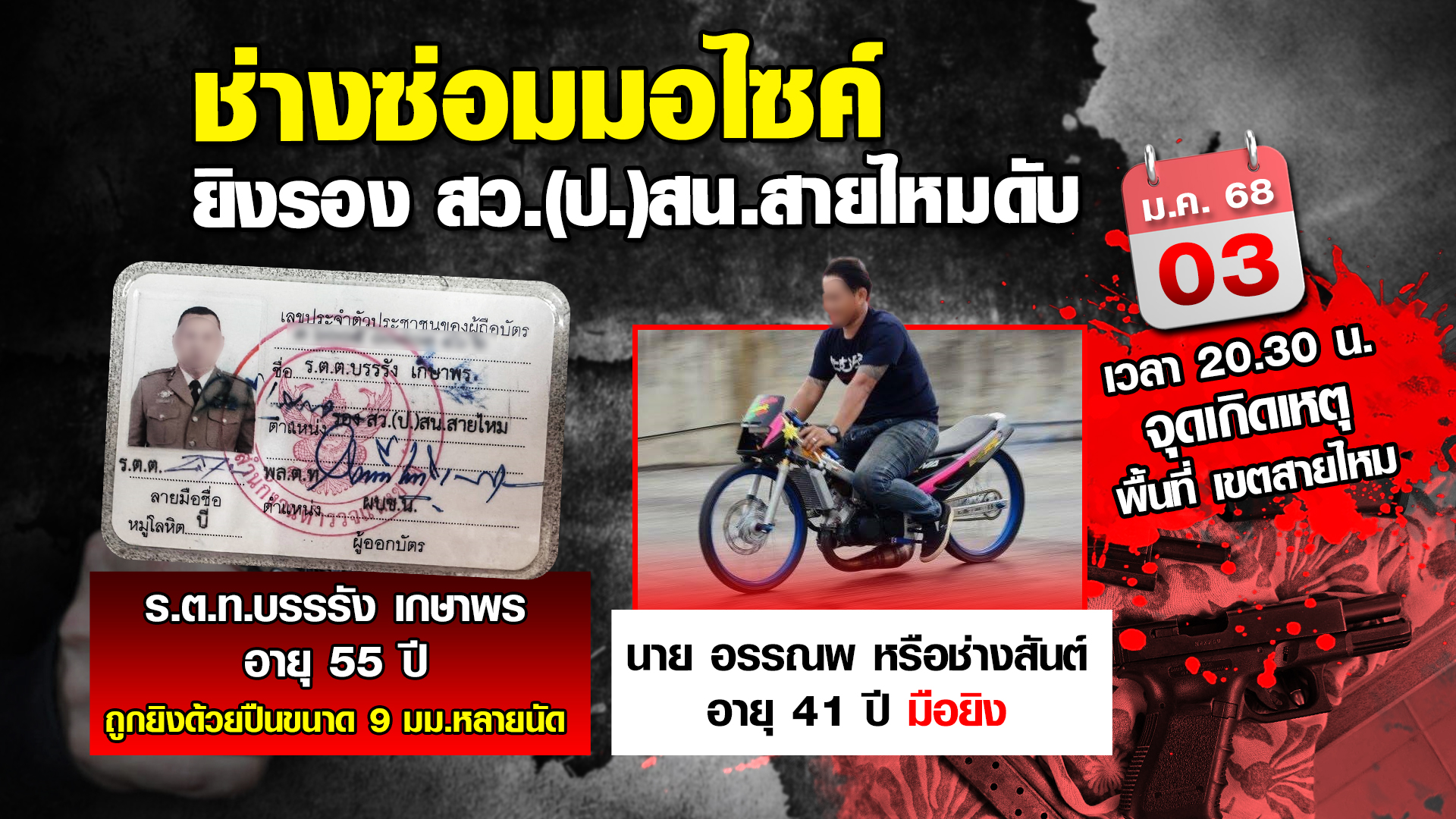 กทม. 4 ม.ค.-รอง สวป.สน.สายไหม ถูกช่างซ่อม จยย. ปืนโหด กระหน่ำยิงหมดแม็ก หลังไม่พอใจ เข้าระงับเหตุทะเลาะกับชายต่างด่าว พร้อม ตะโกนด่า “มึงใหญ่หรอ” ก่อนถูกจับกุมตัวได้