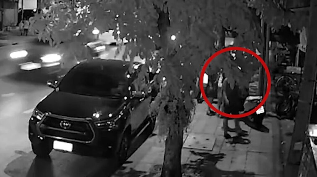 ขณะที่ภาพจากกล้องวงจรปิดอีกมุมหนึ่งที่อยู่ฝั่งหน้าร้านตัดผม สามารถบันทึกเหตุการณ์ หลังจากผู้ก่อเหตุกลับไปเอาอาวุธปืนที่ร้าน ก็ได้ขี่รถจักรยานยนต์ออกมาพร้อมกับเรียกเพื่อนให้มาสมทบ จากนั้นกลุ่มผู้ก่อเหตุได้ตะโกนด่าทอผู้เสียชีวิต ก่อนจะมีเสียงปืนดังขึ้นหลายนัด และขี่รถจักรยานยนต์หลบหนีไป