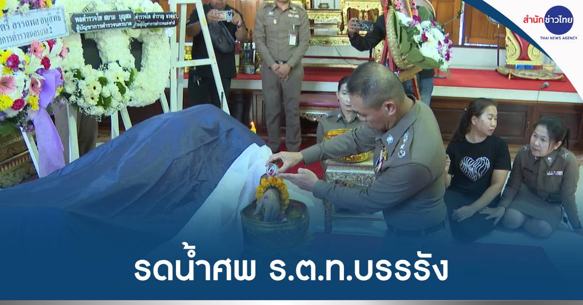 กทม. 4 ม.ค.-ผบช.น. เป็นประธานรดน้ำศพ ร.ต.ท.บรรรัง รอง สวป.สน.สายไหม ที่ถูกยิงเสียชีวิต บรรยากาศในงานเต็มไปด้วยความโศกเศร้า เชื่อผู้ตายไม่ทันสังเกตว่าผู้ก่อเหตุมีอาวุธปืน เพราะปืนส่วนตัวยังอยู่ในซองเก็บปืนและถูกยิงโดยไม่ทันตั้งตัว ยังเชื่อว่ามีคนร่วมมือนำอาวุธปืนไปหลบซ่อน