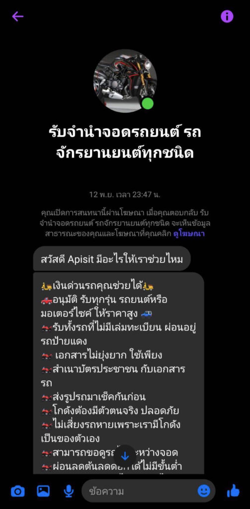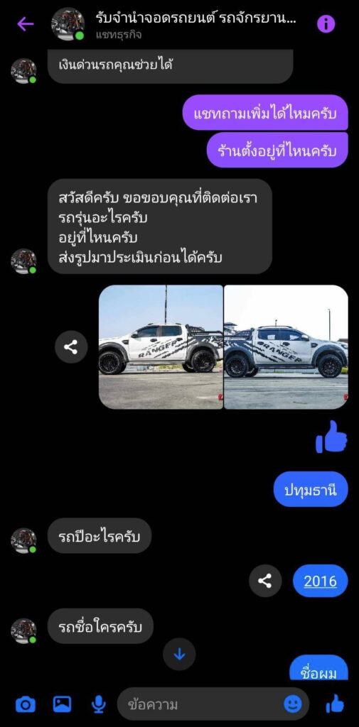 กระทั่งเมื่อวันที่ 26 พฤศจิกายน 2567 เพจได้ล่อลวงให้ผู้เสียหายนำรถมาจำนำในราคา 80,000 บาท โดยนัดหมายส่งมอบรถบริเวณหน้าร้านสะดวกซื้อแห่งหนึ่งในพื้นที่ อ.เมือง จ.ปทุมธานี ตนจึงนำรถกระบะฟอร์ดเรนเจอร์สีขาว ซึ่งซื้อมาในมูลค่าประมาณ 800,000 บาทมาจำนำ เมื่อถึงวันนัดส่งมอบรถ มีผู้ต้องหา 2 คนมาทำหน้าที่รับรถและมอบเงินสดให้กับผู้เสียหายจำนวน 71,000 บาท โดยอ้างว่าอีก 9,000 บาทหักเป็นค่าดอกเบี้ยและค่าจอดรถ
