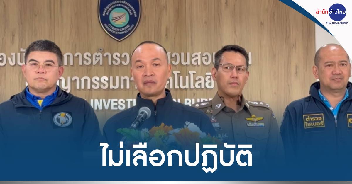 บช.สอท. 17 ม.ค.-ผู้การไซเบอร์ ยืนยันไม่เลือกปฏิบัติจับกุมแอดมินตัดต่อภาพอดีตนายกฯ “ทักษิณ” เร่งตรวจสอบหาขบวนการคอลเซ็นเตอร์โทรศัพท์หลอก “แพทองธาร” ส่วนประเด็นค่ายโทรศัพท์มือถือติดตั้งแอปเงินกู้ อยู่ระหว่างประสานความชัดเจนเรื่องการส่งข้อมูลส่วนบุคคลให้ สคบ.หรือไซเบอร์