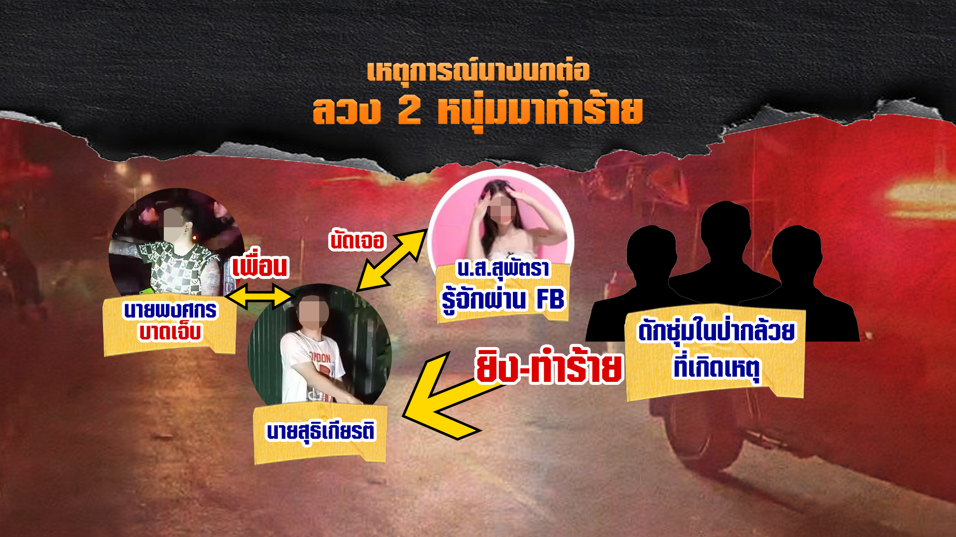ความคืบหน้ากรณีคนร้ายรุมทำร้ายร่างกายผู้เสียหาย 2 คน หลังถูกหญิงสาวที่รู้จักกันในเฟซบุ๊กเพียง 3 วัน ลวงมานัดเจอในซอยเจริญสุข ถนนเลียบทางด่วนกาญจนาภิเษก-ทุ่งครุ ก่อนเรียกพวกที่เป็นชายฉกรรจ์ จำนวน 3 คน ที่ดักซุ่มอยู่ในป่ากล้วยข้างทาง ให้ลงมือทำร้าย หนึ่งในนั้นยังก่อเหตุยิงใส่ผู้เสียหายทั้ง 2 คน 3 นัด คือ นายพงศกร อายุ 30 ปี และนายสุทธิเกียรติ อายุ 33 ปี เพื่อนที่มาด้วยกัน