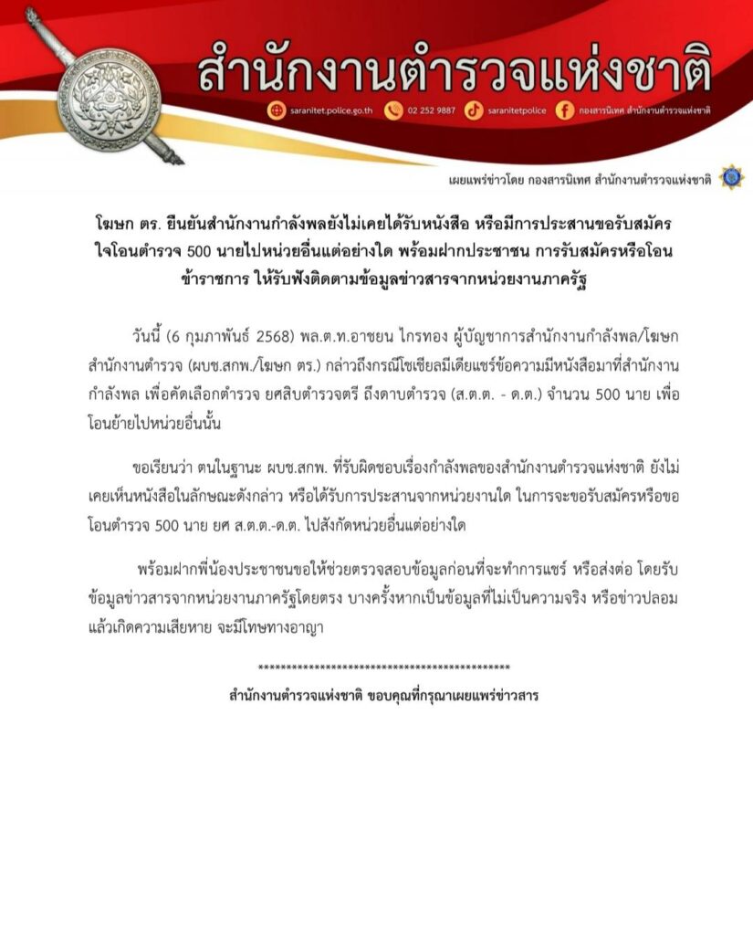 วันนี้ (6 กุมภาพันธ์ 2568) พล.ต.ท.อาชยน ไกรทอง ผู้บัญชาการสำนักงานกำลังพล/โฆษกสำนักงานตำรวจ (ผบช.สกพ./โฆษก ตร.) กล่าวถึงกรณีโชเชียลมีเดียแชร์ข้อความมีหนังสือมาที่สำนักงานกำลังพล เพื่อคัดเลือกตำรวจ ยศสิบตำรวจตรี ถึงดาบตำรวจ (ส.ต.ต. – ด.ต.) จำนวน 500 นาย เพื่อโอนย้ายไปหน่วยอื่นนั้น