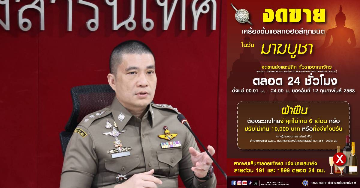 พ.ต.อ.วรศักดิ์ พิสิษฐบรรณกร รองผู้บังคับการสายตรวจและปฏิบัติการพิเศษ รักษาราชการแทนผู้บังคับการกองสารนิเทศ (รอง บก.สปพ.รรท.ผบก.สท.) กล่าวว่า วันมาฆบูชาซึ่งเป็นอีกหนึ่งวันสำคัญทางพุทธศาสนา ปีนี้ตรงกับวันพุธที่ 12 กุมภาพันธ์ 2568 ซึ่งตามประกาศราชกิจจานุเบกษา กำหนดวันห้ามขายเครื่องดื่มแอลกอฮอล์ในวันสำคัญทางพุทธศาสนา 5 วัน ได้แก่ วันมาฆบูชา วันวิสาขบูชา วันอาสาฬหบูชา วันเข้าพรรษา และวันออกพรรษา โดยมีผลตั้งแต่วันที่ 26 ธันวาคม 2567 เป็นต้นไป ยกเว้นการขายในอาคารที่ให้บริการแก่ผู้โดยสารภายในสนามบินที่ให้บริการเที่ยวบินระหว่างประเทศนั้น