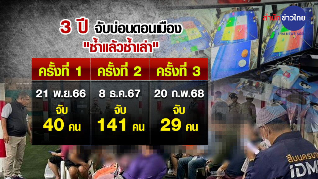 ดอนเมือง 21 ก.พ.- จับแล้วจับอีก! “บ่อนดอนเมือง” ตลอด 4-5 ปีที่ผ่านมา จับแล้วกว่า 20 ครั้ง กลับมาเปิดอีก แถมยังเพิ่มความแข็งแกร่งของด่านประตู