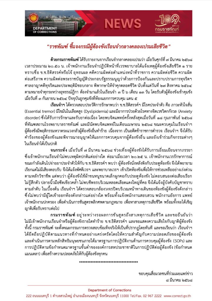 ด้วยกรมราชทัณฑ์ ได้รับรายงานจากเรือนจำกลางคลองเปรมว่า เมื่อวันศุกร์ที่ 7 มีนาคม 2568 เวลาประมาณ 20.50 น. เจ้าพนักงานเรือนจำปฏิบัติหน้าที่เวรพยาบาลได้แจ้งเหตุผู้ต้องขังเสียชีวิต 1 ราย ทราบชื่อ ข.ช.ธิติสรรค์ หรือโจ้ อุทธนผล คดีความผิดต่อตำแหน่งหน้าที่ราชการ ความผิดต่อชีวิต ความผิดต่อเสรีภาพ ความผิดต่อพระราชบัญญัติประกอบรัฐธรรมนูญว่าด้วยการป้องกันและปราบปรามการทุจริตฯ ศาลอาญาคดีทุจริตและประพฤติมิชอบกลาง พิพากษาให้จำคุกตลอดชีวิต นับตั้งแต่วันที่ 27 สิงหาคม 2564 ตามหมายจำคุกระหว่างอุทธรณ์ฎีกา ต้องจำมาแล้วในเรือนจำ 3 ปี 6 เดือน 13 วัน โดยรับตัวผู้ต้องขังเข้าคุมขังเมื่อวันที่ 3 กันยายน 2564 ปัจจุบันถูกคุมขังที่ห้องแยกการควบคุม แดน 5
