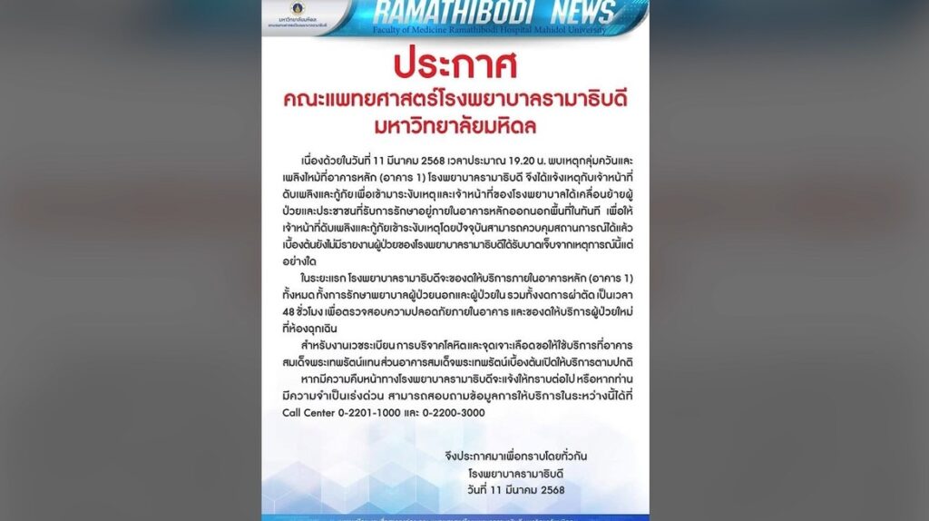 ต่อมามีประกาศคณะแพทยศาสตร์โรงพยาบาลรามาธิบดี มหาวิทยาลัยมหิดล ฉบับที่ 1 เนื่องด้วยในวันที่ 11 มีนาคม 2568 เวลาประมาณ 19.20 น. พบเหตุกลุ่มควันและเพลิงไหม้ที่อาคารหลัก (อาคาร 1) โรงพยาบาลรามาธิบดี จึงได้แจ้งเหตุกับเจ้าหน้าที่ดับเพลิงและกู้ภัยเพื่อเข้ามาระงับเหตุ และเจ้าหน้าที่ของโรงพยาบาลได้เคลื่อนย้ายผู้ป่วยและประชาชนที่รับการรักษาอยู่ภายในอาคารหลักออกนอกพื้นที่ในทันทีเพื่อให้เจ้าหน้าที่ดับเพลิงและกู้ภัยเข้าระงับเหตุ โดยปัจจุบันสามารถควบคุมสถานการณ์ได้แล้ว เบื้องต้นยังไม่มีรายงานผู้ป่วยของโรงพยาบาลรามาธิบดี ได้รับบาดเจ็บจากเหตุการณ์