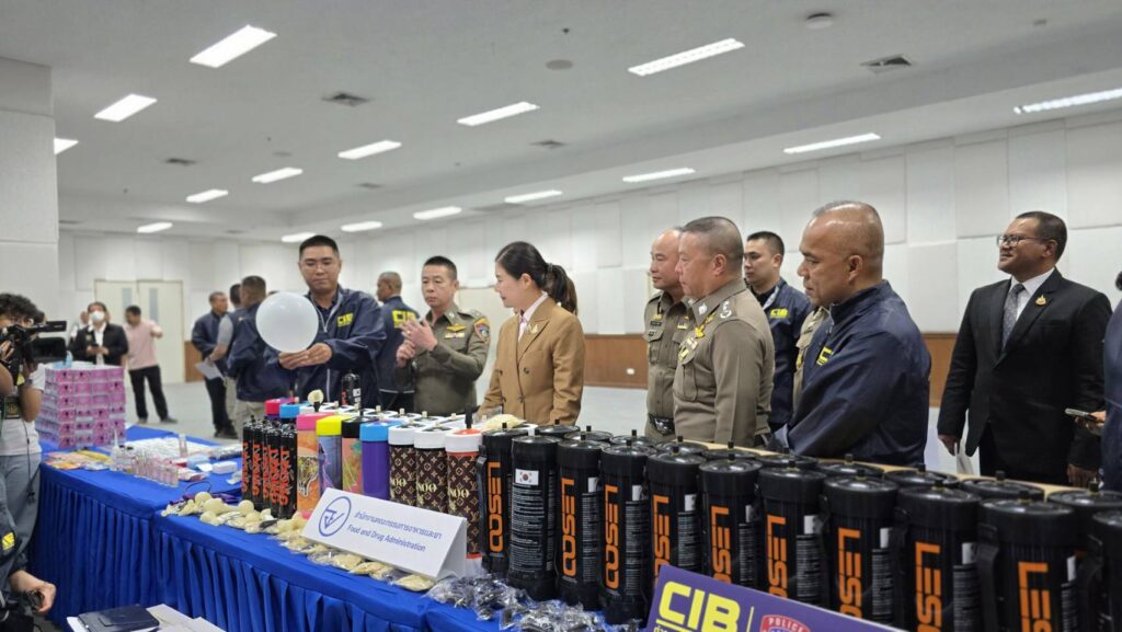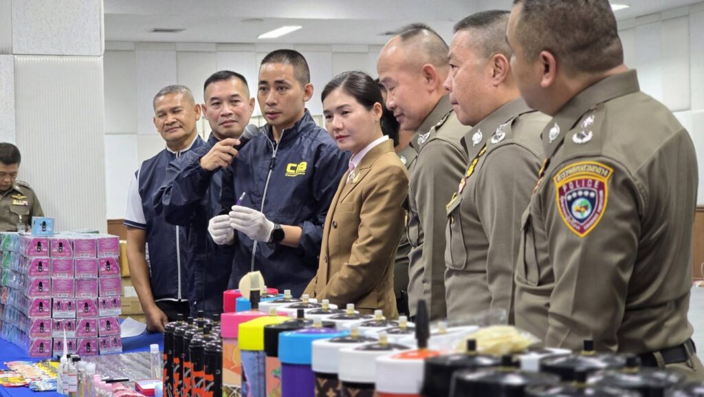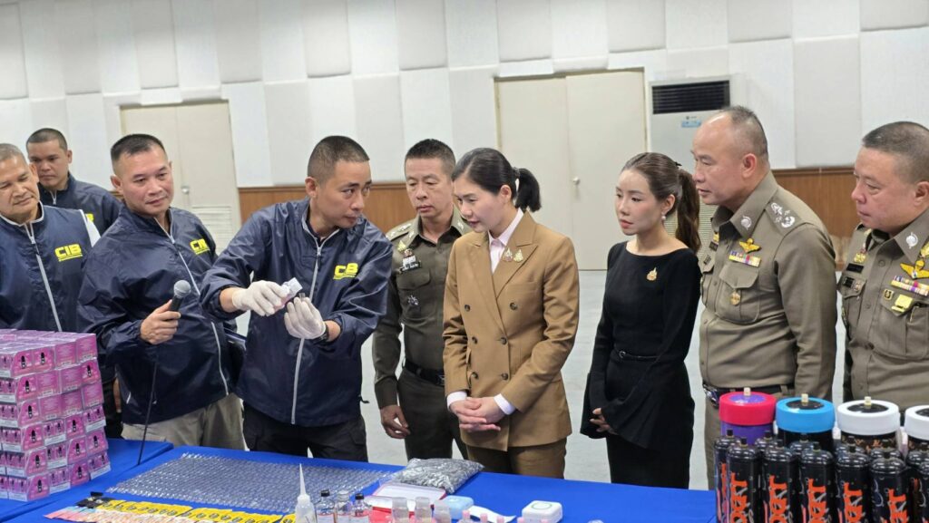 บช.ก. 13 มี.ค. – “จิราพร” แถลงผลปราบปรามจับกุมผู้ต้องหาลักลอบจำหน่ายบุหรี่ไฟฟ้า พบผลิต Pod K รายแรกในไทย และผลปฏิบัติการกวาดล้างตัดตอนลูกโป่งบรรจุแก๊สหัวเราะ