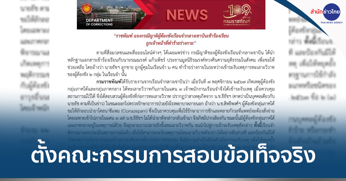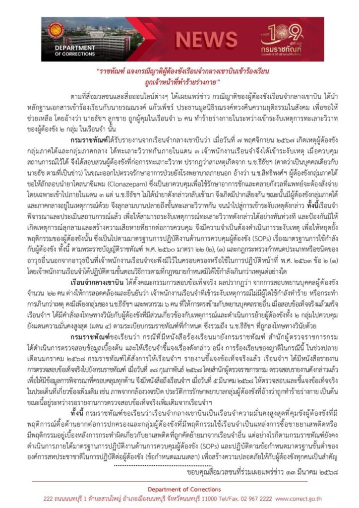กรมราชทัณฑ์ขอเรียนว่า กรณีที่มีหนังสือร้องเรียนมายังกรมราชทัณฑ์ สำนักผู้ตรวจราชการกรม ได้ดำเนินการตรวจสอบข้อมูลเบื้องต้น และให้เรือนจำชี้แจงเรื่องดังกล่าว อนึ่ง การร้องเรียนของญาติในกรณีนี้ ในช่วงปลายเดือนมกราคม 2568 กรมราชทัณฑ์ได้สั่งการให้เรือนจำฯ รายงานชี้แจงข้อเท็จจริงแล้ว เรือนจำฯ ได้มีหนังสือรายงาน การตรวจสอบข้อเท็จจริงไปยังกรมราชทัณฑ์ เมื่อวันที่ 18 กุมภาพันธ์ 2568 โดยสำนักผู้ตรวจราชการกรม ตรวจสอบรายงานดังกล่าวแล้ว เพื่อให้มีข้อมูลการพิจารณาที่ครอบคลุมทุกด้าน จึงมีหนังสือถึงเรือนจำฯ เมื่อวันที่ 5 มีนาคม 2568 ให้ตรวจสอบและชี้แจงข้อเท็จจริงในประเด็นที่เกี่ยวข้องเพิ่มเติม เช่น ภาพจากกล้องวงจรปิด ประวัติการรักษาพยาบาลกลุ่มผู้ต้องขังที่อ้างว่าถูกทำร้ายร่างกาย เป็นต้น ขณะนี้อยู่ระหว่างรอรายงานการตรวจสอบข้อเท็จจริงเพิ่มเติมจากเรือนจำฯ