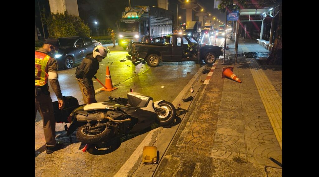เมื่อเวลา 02.40 น. ตำรวจ สน.คันนายาว รับแจ้งอุบัติเหตุรถชนกัน มีผู้บาดเจ็บ บริเวณด่านตรวจวัดแอลกอฮอล์ของตำรวจ บก.จร. ปากซอยรามอินทรา 69 แขวงคันนายาว เขตคันนายาว กรุงเทพมหานคร จึงไปตรวจสอบพร้อมกู้ภัยร่วมกตัญญู