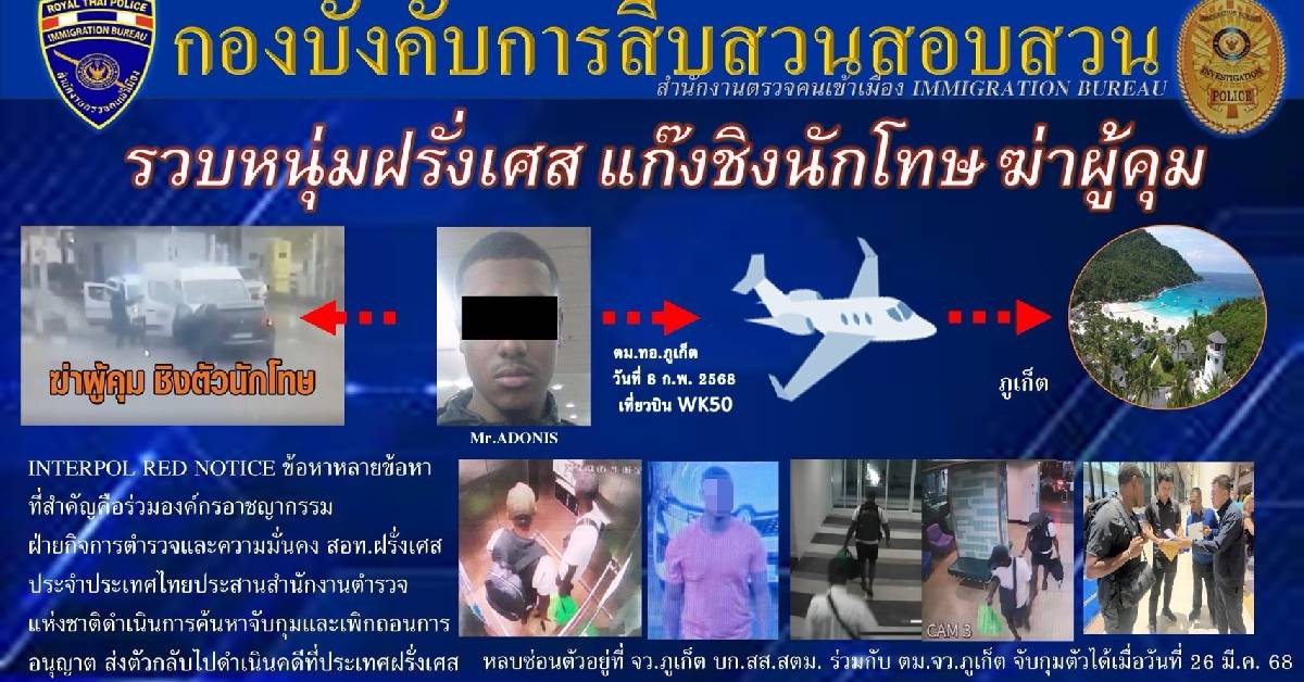 พล.ต.ต.พันธนะ นุชนารถ รองผู้บัญชาการสำนักงานตรวจคนเข้าเมือง, พล.ต.ต.ภานพ วรธนัชชากุล ผู้บังคับการสืบสวนสอบสวนสำนักงานตรวจคนเข้าเมือง, พ.ต.อ.รัฐโชติ โชติคุณ รองผู้บังคับการสืบสวนสอบสวนสำนักงานตรวจคนเข้าเมือง รวมแถลงข่าวการจับกุมผู้ต้องหา รายสำคัญ สืบเนื่องมาจาก ฝ่ายกิจการตำรวจและความมั่นคงสถานเอกอัครราชทูตฝรั่งเศสประจำประเทศไทย ประสานมายังสำนักงานตำรวจแห่งชาติเพื่อดำเนินการค้นหา จับกุม และเพิกถอนการอนุญาต “นายอาโดนิส (Adonis)” บุคคลตามหมายจับฝรั่งเศสและหมายแดงตำรวจสากล ในข้อหาร่วมองค์กรอาชญากรรมเพื่อก่อเหตุอาชญากรรมร้ายแรง จากการมีส่วนร่วมในการชิงตัว “นาย Mohamed” นักโทษในเรือนจำ เมื่อวันที่ 14 พฤษภาคม 2567 เป็นเหตุให้มีเจ้าหน้าที่เรือนจำเสียชีวิต 2 ราย และได้รับบาดเจ็บสาหัส 3 ราย