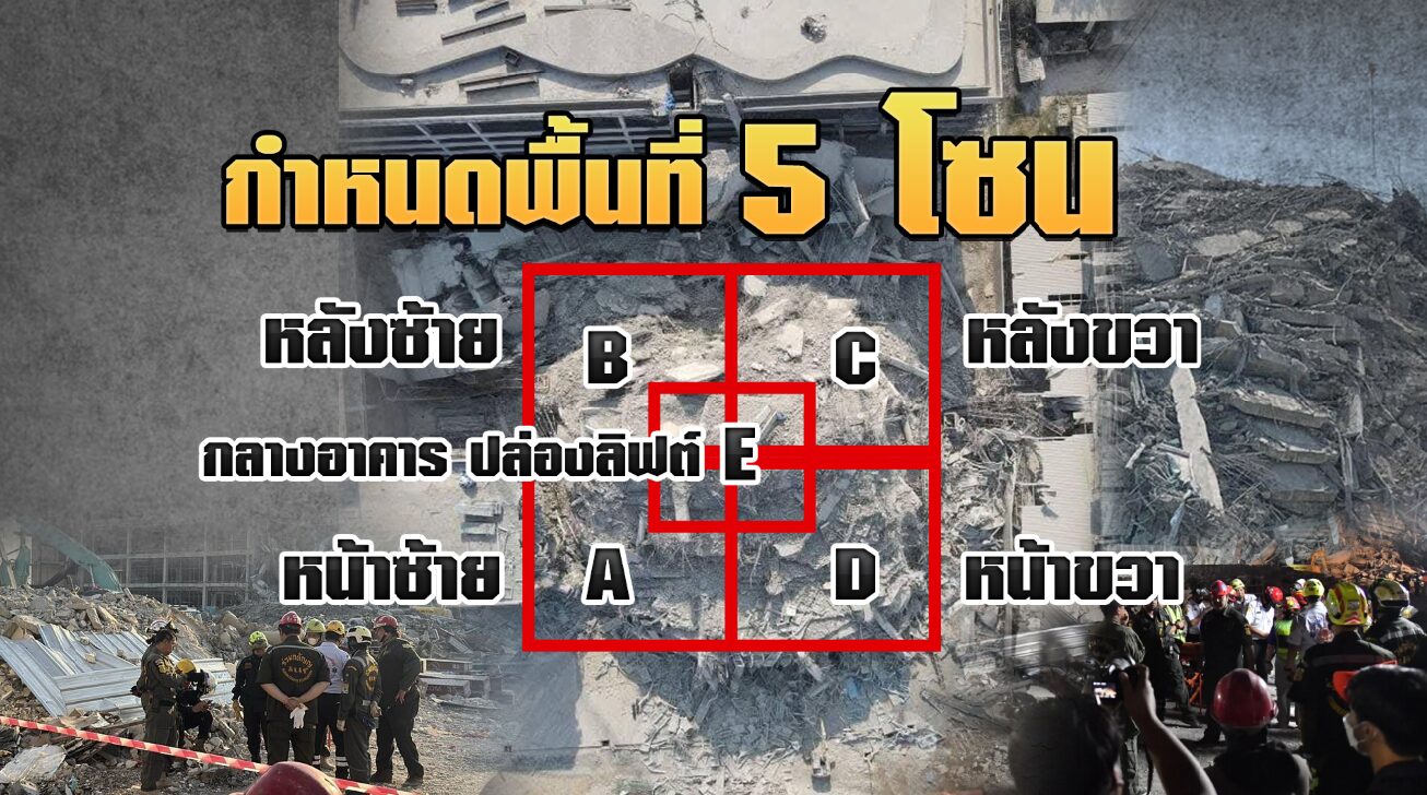โดยพื้นที่ที่เร่งนำรถแบคโฮติดหัวขุดเจาะเข้าไป จะอยู่ที่บริเวณโซน D ที่อยู่ด้านหน้าซ้ายมือ และจะทำควบคู่ไปกับโซนเอ ที่มีการทำทางลาดไปถึงโซน B เชื่อมต่อไปที่โซน C เพื่อให้เครื่องจักรใหญ่สามารถเข้าไปเคลียร์กองซากปูนและซากเหล็กได้ และอย่างที่เคยบอกค่ะว่าในโซน B กับตัว C มีฐานที่แข็งแรง จึงต้องใช้รถแบ็กโฮขึ้นไปจากบริเวณตรงนี้เพื่อโกยดินบนยอดลงมา เพื่อไม่ให้เกิดการถล่มซ้ำ ขณะที่บุคลากรกู้ภัยไทยและนานาชาติรวมถึงสุนัข K9 ตอนนี้ได้หยุดพักภารกิจเพื่อให้เครื่องจักรทุกชนิดสามารถเดินหน้าทำงานเต็มที่