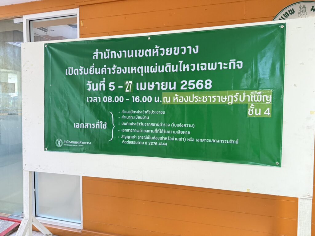 ภายในสำนักงาน มีเจ้าหน้าที่ตำรวจ จาก สน.ในท้องที่มาอำนวยความสะดวก แจ้งลงบันทึกประจำวัน เพื่อออกเอกสารประกอบการขอรับการเยียวยา แต่ทางเจ้าหน้าที่ก็แนะนำว่าหากเพื่อความรวดเร็วก็สามารถลงบันทึกประจำวันมาก่อนที่จะมาติดต่อสำนักงานเขตได้ ส่วนภาพถ่ายความเสียหายเมื่อถ่ายแล้ว ต้องปริ้นออกมาเป็นเอกสารด้วยเพื่อประกอบให้เห็นภาพความเสียหาย โดยข้อมูลที่สำนักงานเขตห้วยขวาง ซื้อเริ่มเปิดให้ยื่นเรื่องตั้งแต่ 31 มี.ค.-7 เม.ย.68 มียอดรวมของผู้ที่มายื่นขอรับการเยียวยา จำนวน 1,166 ราย โดยสำนักงานเขตเปิดรับการยื่นคำร้องเหตุแผ่นดินไหวถึงวันที่ 27 เมษายนนี้