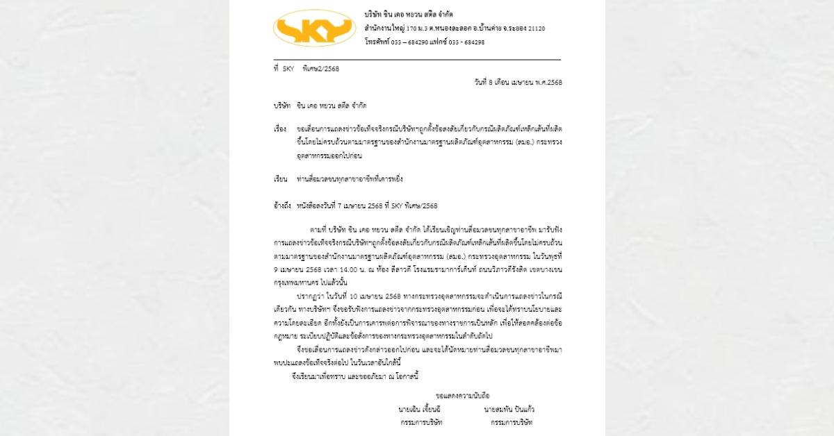โดยในรายละเอียดหนังสือระบุสาเหตุที่ต้องเลื่อนการแถลงวข่าวออกไป เนื่องจากปรากฏว่า ในวันที่ 10 เมษายน 2568 กระทรวงอุตสาหกรรมจะดำเนินการแถลงข่าวในกรณีเดียวกัน ทางบริษัทฯ จึงขอรับฟังการแถลงข่าวจากกระทรวงอุตสาหกรรมก่อน เพื่อจะได้รับทราบนโยบายและความโดยละเอียด อีกทั้งยังเป็นการเคารพต่อการพิจารณาของทางราชการเป็นหลัก เพื่อให้สอดคล้องต่อข้อกฏหมาย ระเบียบปฏิบัติ และข้อสั่งการของกระทรวงอุตสาหกรรมในลำดับถัดไป จึงขอเลื่อนการแถลงข่าวออกไปก่อน และจะได้นัดหมายสื่อมวลชนมาพบปะแถลงข้อเท็จจริงต่อไป ในวันเวลาอันใกล้นี้ โดยมีชื่อกรรมการบริษัท 2 ราย ที่ด้านล่างของเอกสาร คือนายเฉิน เจี้ยนฉี กรรมการบริษัท และนายสมพัน ปันแก้ว กรรมการบริษัท