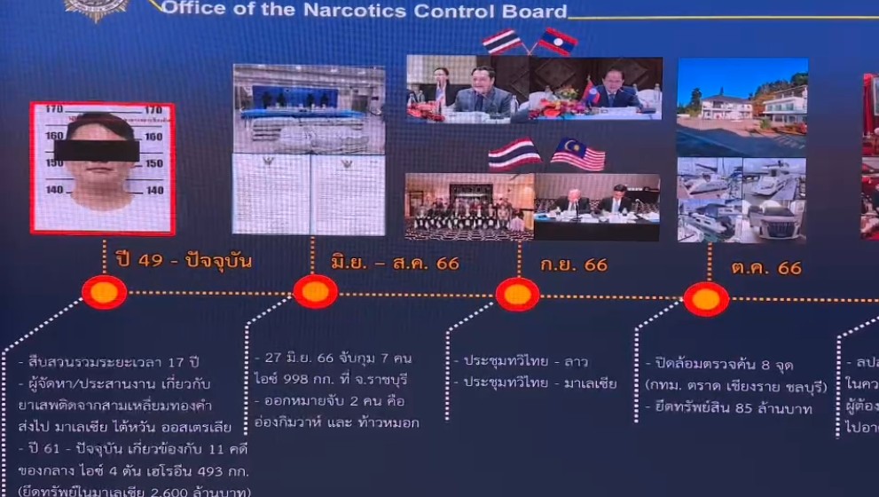 เลขาธิการ ป.ป.ส. ยังแถลงผลการจับกุมผู้สั่งการเครือข่ายยาเสพติดรายสำคัญอีก 2 คดี ได้แก่ การจับกุมผู้สั่งการลำเลียงยาเสพติดเครือข่ายเจ้าหน้าที่ของรัฐเมื่อวันที่ 3 เมษายน 2568 จับกุม น.ส.พรกนก ผู้ต้องหาตามหมายจับศาลจังหวัดเชียงราย ได้ที่บ้านพักในพื้นที่ จ.เชียงใหม่ โดย น.ส.พรกนก เป็นผู้สั่งการและประสานงาน ในเครือข่ายลักลอบลำเลียงยาเสพติดจากการจับกุมข้าราชการ อบต. พร้อมของกลาง ยาบ้า 2ล้านเม็ดในพื้นที่เชียงรายยึดทรัพย์สิน 45 ล้านบาท ก่อนหน้านี้ โดยล่าสุดได้ยึดอายัดทรัพย์ น.ส.พรกนก เป็นที่ดินพร้อมสิ่งปลูกสร้าง และยานพาหนะ เพิ่มรวมมูลค่าประมาณ 5 ล้านบาท