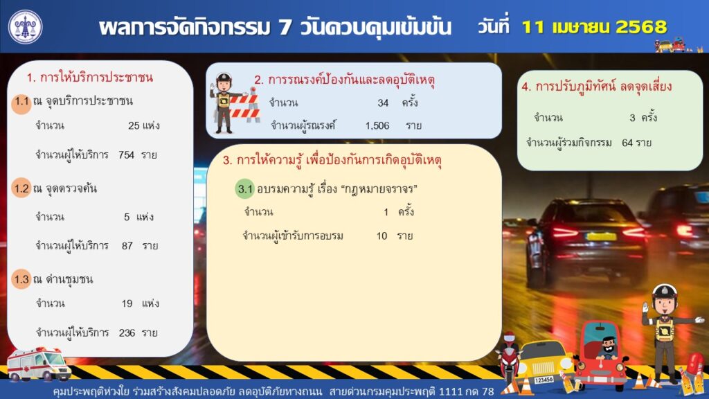นอกจากนี้ สำนักงานคุมประพฤติทั่วประเทศยังได้จัดกิจกรรมสนับสนุนการปฏิบัติงานของเจ้าหน้าที่ในการให้บริการประชาชน ณ จุดบริการประชาชน ด่านตรวจค้น และด่านชุมชน จำนวน 49 จุด โดยมีอาสาสมัครคุมประพฤติ เครือข่ายยุติธรรมชุมชน ผู้ถูกคุมความประพฤติ ประชาชน และภาคีเครือข่าย จำนวนทั้งสิ้น 1,077 คนเข้าร่วมกิจกรรม พร้อมทั้งจัดกิจกรรมรณรงค์ประชาสัมพันธ์ มีผู้เข้าร่วมรณรงค์ 1,506 ราย ตลอดจนทำงานบริการสังคมโดยการปรับภูมิทัศน์ตามจุดเสี่ยงในชุมชน ร่วมแจกหมวกกันน็อกให้กับประชาชนและผู้ถูกคุมความประพฤติ ร่วมพูดคุยและเน้นย้ำการขับขี่ให้ปลอดภัยกับประชาชนผู้ใช้รถใช้ถนน และทำความสะอาดบริเวณสถานีขนส่งผู้โดยสาร เพื่อให้ประชาชนเดินทางกลับภูมิลำเนาหรือท่องเที่ยวอย่างปลอดภัยในเทศกาลสงกรานต์นี้ .-สำนักข่าวไทย