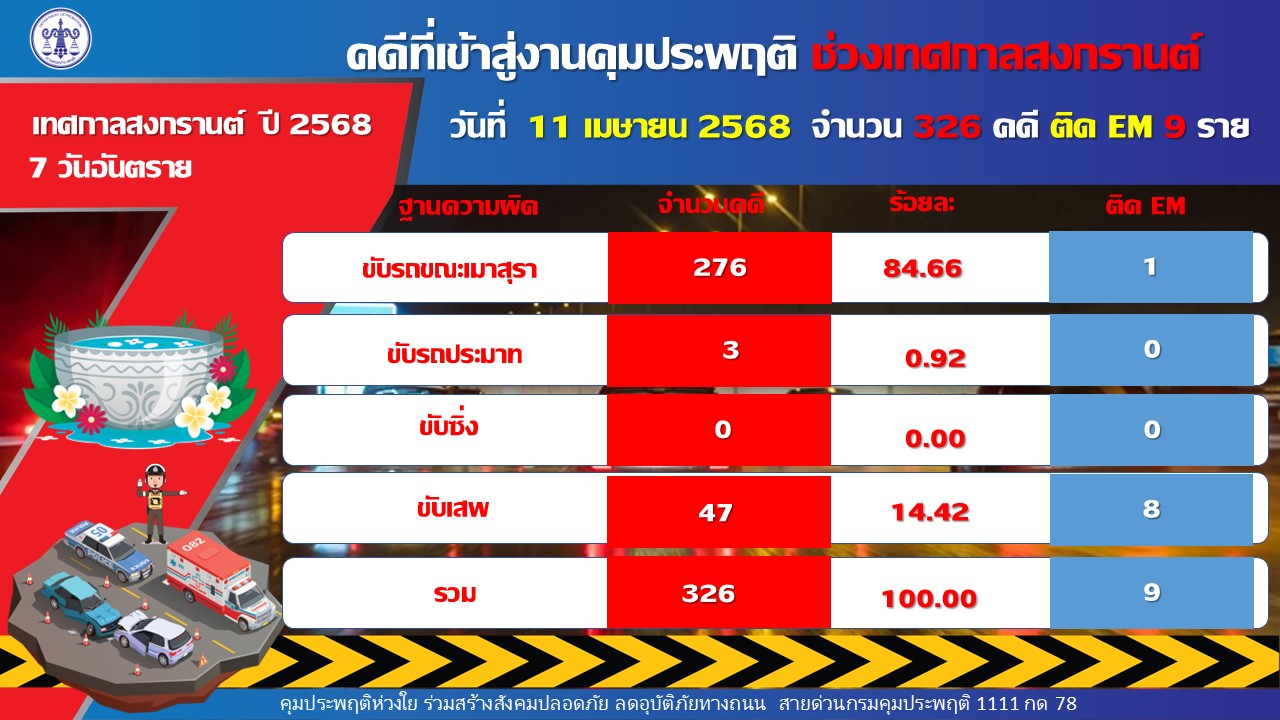 เมื่อเปรียบเทียบคดีขับรถขณะเมาสุราในเทศกาลสงกรานต์ 2567 มีจำนวน 258 คดี กับสงกรานต์ 2568 จำนวน 276 คดี พบว่า เพิ่มขึ้น 18 คดี สำหรับจังหวัดที่มีสถิติคดีขับรถขณะเมาสุราสูงสุด 3 อันดับ ได้แก่ นนทบุรี 40 คดี สมุทรปราการ 35 คดี และ กำแพงเพชร 27 คดี