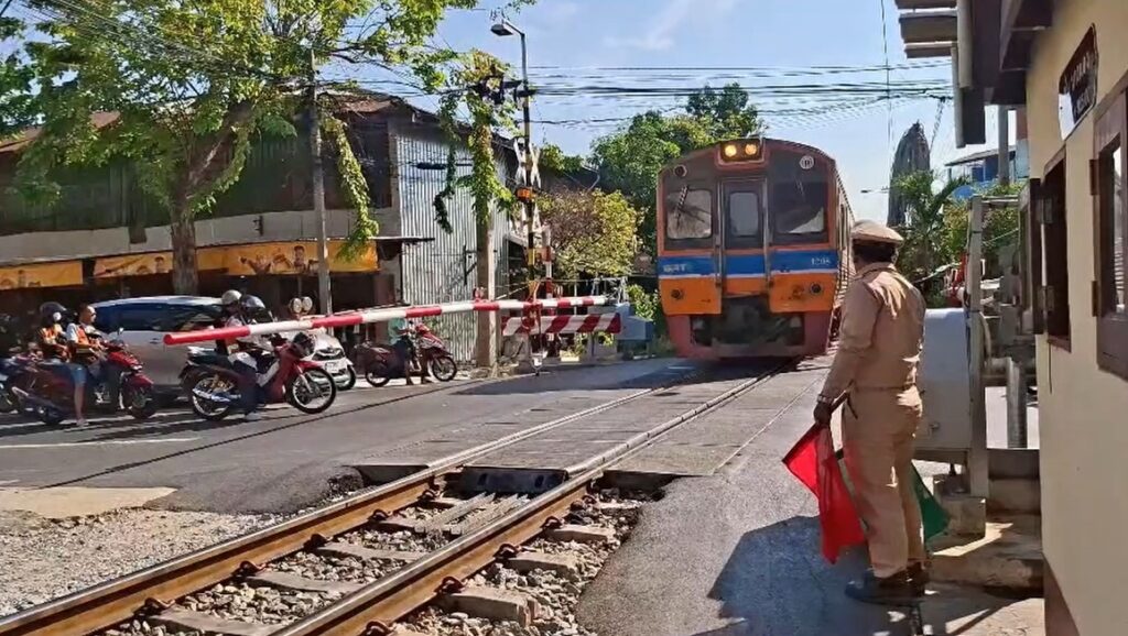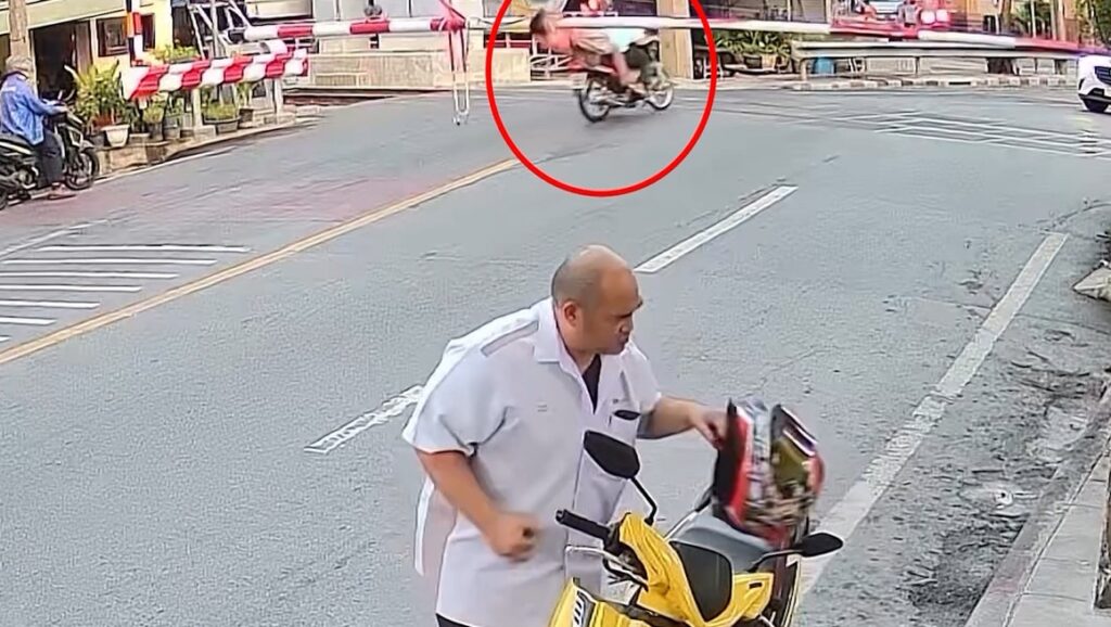 กรุงเทพฯ 24 เม.ย. – อุทาหรณ์! สามีพาภรรยาซ้อนท้ายรถจักรยานยนต์ ขี่ฝ่าสัญญาณเตือนไม้กั้นรถไฟ ภรรยาร่วงกระแทกพื้น โชคดีรีบลุกข้ามไปอีกฝากได้ทันก่อนรถไฟแล่นมาถึง