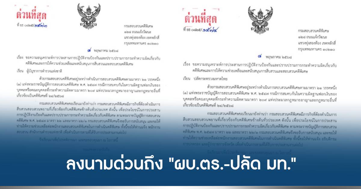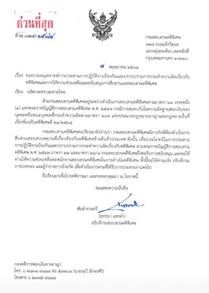 ผู้สื่อข่าวรายงานเพิ่มเติมว่า วันเดียวกัน พ.ต.ต.ยุทธนา แพรดำ อธิบดีกรมสอบสวนคดีพิเศษ (ดีเอสไอ) ลงนามคำสั่ง ด่วนที่สุด ที่ ยธ 0825/1574 เรื่อง ขอความอนุเคราะห์การประสานการปฏิบัติงานป้องกันและปราบปรามการกระทำความผิดเกี่ยวกับคดีพิเศษและการให้ความช่วยเหลือและสนับสนุนการสืบสวนและสอบสวนคดีพิเศษ เรียน ปลัดกระทรวงมหาดไทย