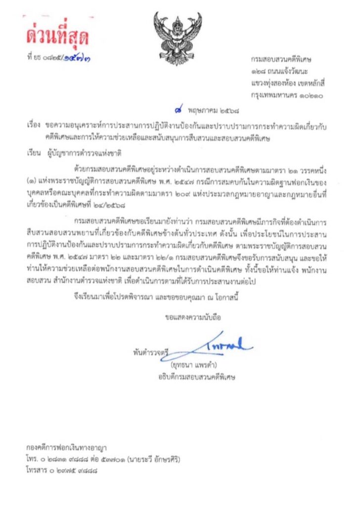 วันนี้ (9 พ.ค.) ผู้สื่อข่าวรายงานว่า วานนี้ (8 พ.ค.) พ.ต.ต.ยุทธนา แพรดำ อธิบดีกรมสอบสวนคดีพิเศษ (ดีเอสไอ) ลงนามคำสั่ง ด่วนที่สุด ที่ ยธ 0825/1573 เรื่อง ขอความอนุเคราะห์การประสานการปฏิบัติงานป้องกันและปราบปรามการกระทำความผิดเกี่ยวกับคดีพิเศษและการให้ความช่วยเหลือและสนับสนุนการสืบสวนและสอบสวนคดีพิเศษ เรียน ผู้บัญชาการตำรวจแห่งชาติ