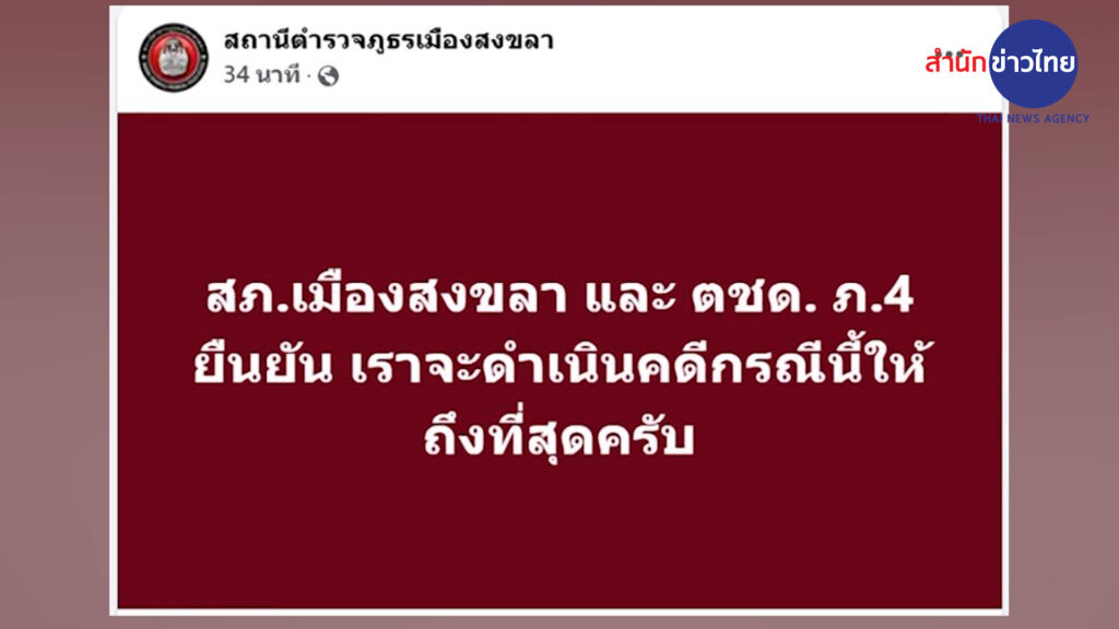 ขณะที่เพจเฟซบุ๊ก สถานีตำรวจภูธรเมืองสงขลา ได้โพสต์ข้อความว่า “สภ.เมืองสงขลา และ ตชด. ภ.4 ยืนยัน เราจะดำเนินคดีกรณีนี้ให้ถึงที่สุดครับ” .-สำนักข่าวไทย
