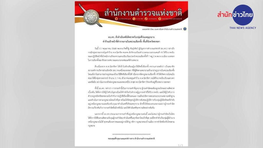 เมื่อช่วงค่ำวานนี้ พล.ต.อ.กิตติ์รัฐ พันธุ์เพชร์ ผู้บัญชาการตำรวจแห่งชาติ (ผบ.ตร.) สั่งการ ผบก.ภ.จ.สงขลา ดำเนินคดีเด็ดขาดกับกลุ่มชายฉกรรจ์ ก่อเหตุอุกอาจทำร้ายเจ้าหน้าที่ตำรวจ ภายในหน่วยเลือกตั้งพื้นที่ จ.สงขลา ทำให้ ‘ด.ต.’ ได้รับบาดเจ็บ หลังเข้าห้ามปรามการถ่ายภาพในหน่วยเลือกตั้ง พร้อมสั่งตั้งชุดปฏิบัติการพิเศษจัดการกลุ่มผู้มีอิทธิพล ทำตัวเหนือกฎหมาย ย้ำให้ดำเนินคดีทุกความผิดอย่างเข้มข้น