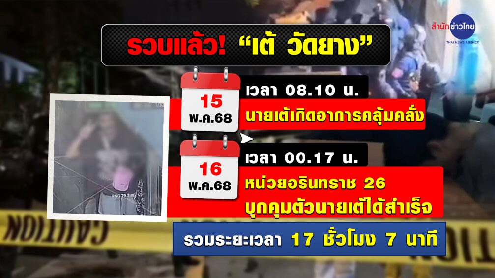 กทม. 16 พ.ค. – ตำรวจคุมตัว “เต้ วัดยาง” ได้แล้ว หลังเจรจานานกว่า 17 ชม. เจ้าตัวมีสภาพอิดโรยอยู่ภายในบ้าน ยืนยันปฏิบัติการยุทธวิธี พร้อมดำเนินคดีข้อหาหนัก
