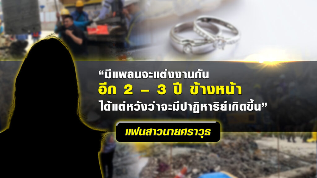 ด้านแฟนสาวของผู้ประสบเหตุอยู่ที่ จ.ศรีสะเกษ ล่าสุดทราบเรื่องแล้ว บอกว่ารู้สึกใจหาย จิตใจแทบไม่อยู่กับเนื้อกับตัว เมื่อวันที่ 18 พ.ค.ที่ผ่านมา เป็นครั้งสุดท้ายที่ตนได้คุยกับนายศราวุธ ก่อนเกิดเหตุรู้สึกเหมือนมีลางร้าย เพราะอยู่ดีๆ ที่บ้านตนไฟก็ดับและมีเสียงอีการ้อง จากเหตุการณ์แปลกๆ ที่เกิดขึ้นทำให้ตนรู้สึกใจไม่ดี คิดว่าต้องมีเหตุอะไรเกิดขึ้นแน่ๆ กระทั่งมาเกิดเหตุร้าย นอกจากนี้มีแพลนจะแต่งงานกันในอีก 2-3 ปีข้างหน้า ตอนนี้ได้แต่เพียงหวังว่าจะมีปาฏิหาริย์เกิดขึ้น.-สำนักข่าวไทย