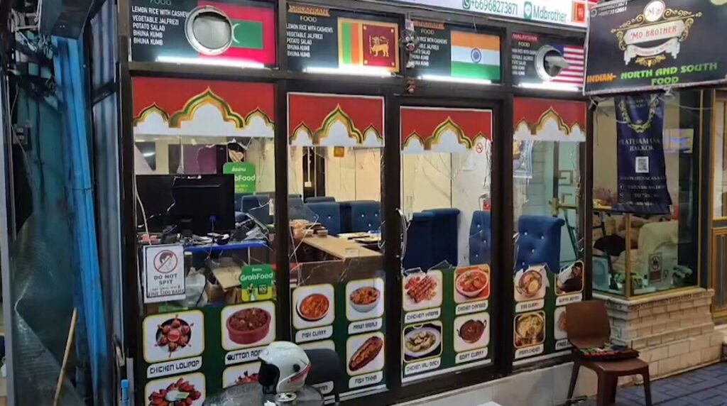 ผู้สื่อข่าวลงพื้นที่ตรวจสอบพบเป็นร้านอาหารอินเดียแห่งแรก มีร่องรอยคราบเลือดที่บริเวณด้านหน้าร้านส่วนกระจกที่ร้านแตกละเอียดพังทุกบาน ส่วนอีกแห่งอยู่ห่างออกไปประมาณ 15 เมตร ลักษณะร้านสภาพกระจกแตกละเอียดพังยับเยินมีร่องรอยคราบเลือดที่บริเวณด้านหน้าร้าน รวมถึงภายในร้านและหลังร้านเป็นจำนวนมากร่องรอยถูกทุบทำลายข้าวของกระจัดกระจาย และมีร่องรอยคราบเลือดเต็มพื้นร้าน